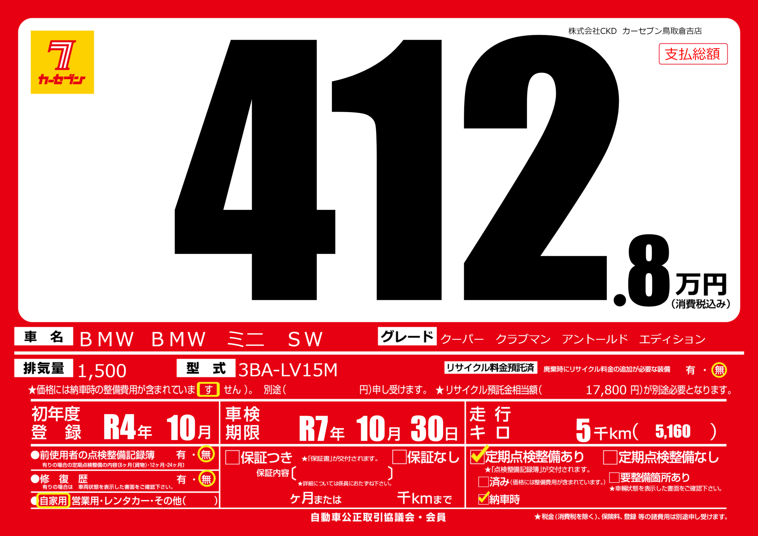 | 車名 | BMW BMW ミニ SW | グレード ミッション 排気量 |