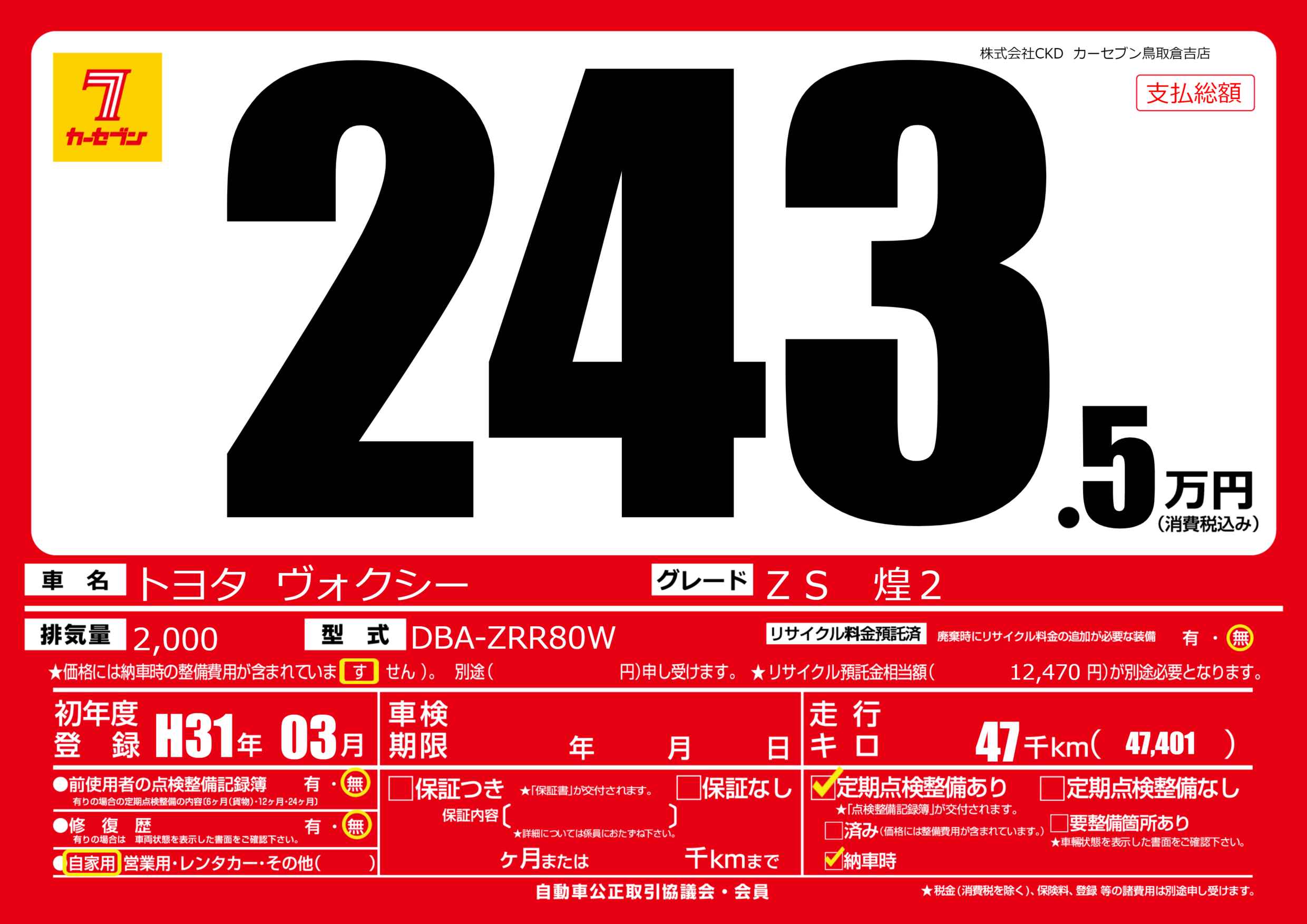 | 走行キロ | 4.7万km | 初年度登録 | H31年03月 |