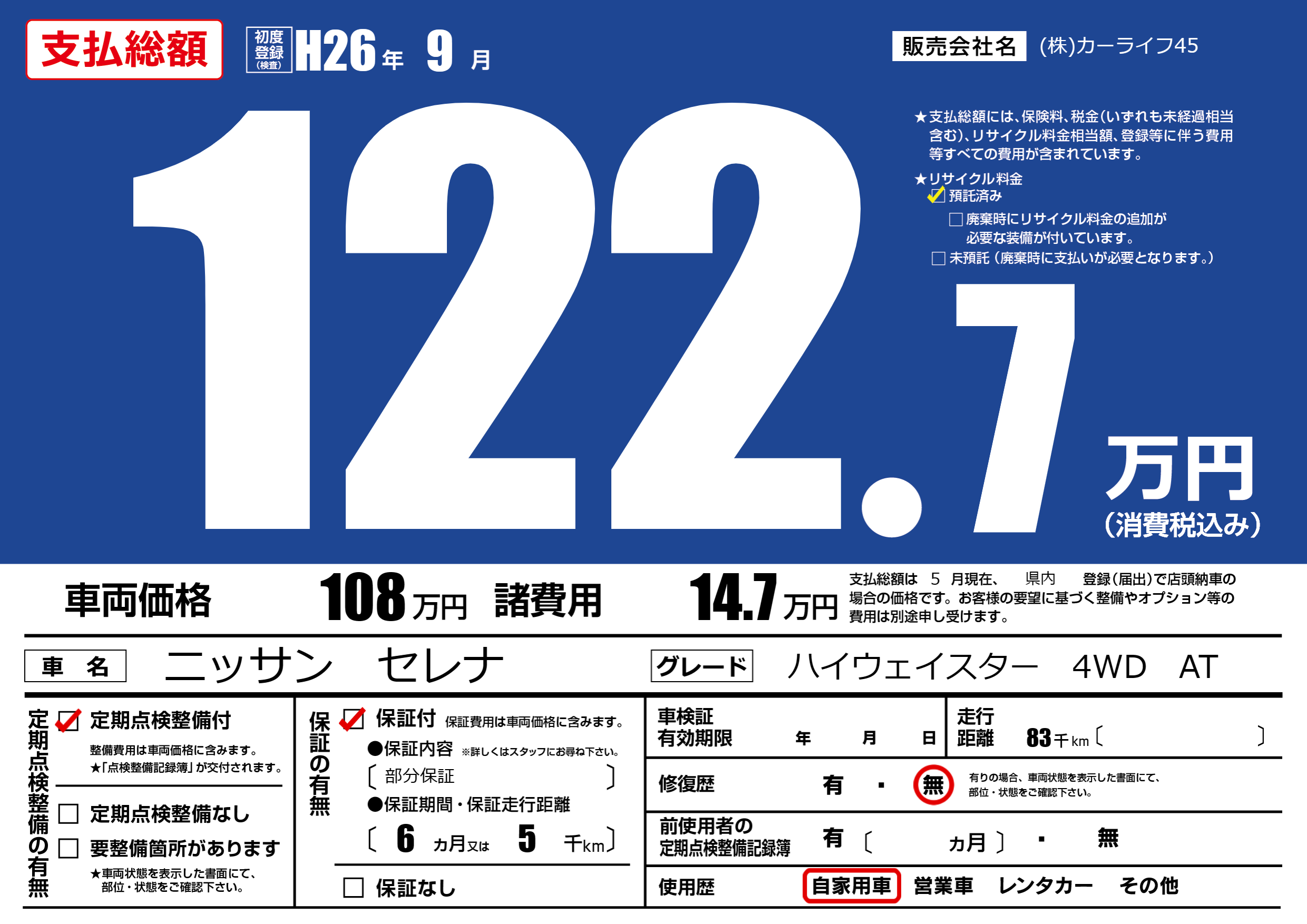 | 走行キロ | 8.3万km | 初年度登録 | H26年9月 |
