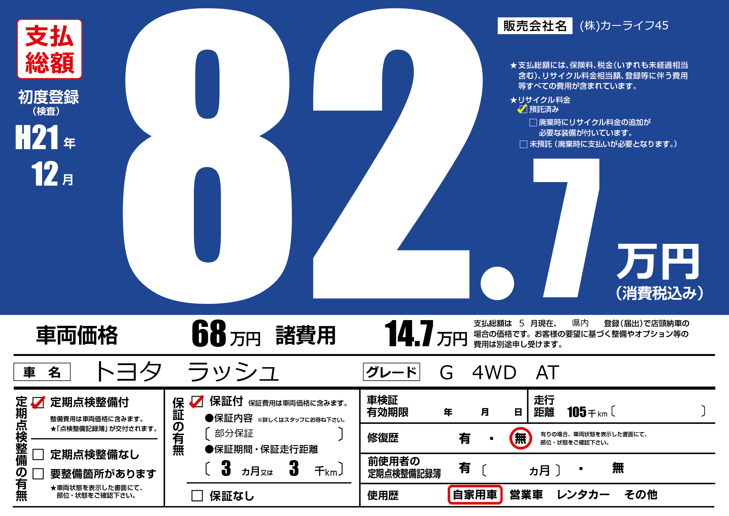 | 走行キロ | 10.5万km | 初年度登録 | H21年12月 |