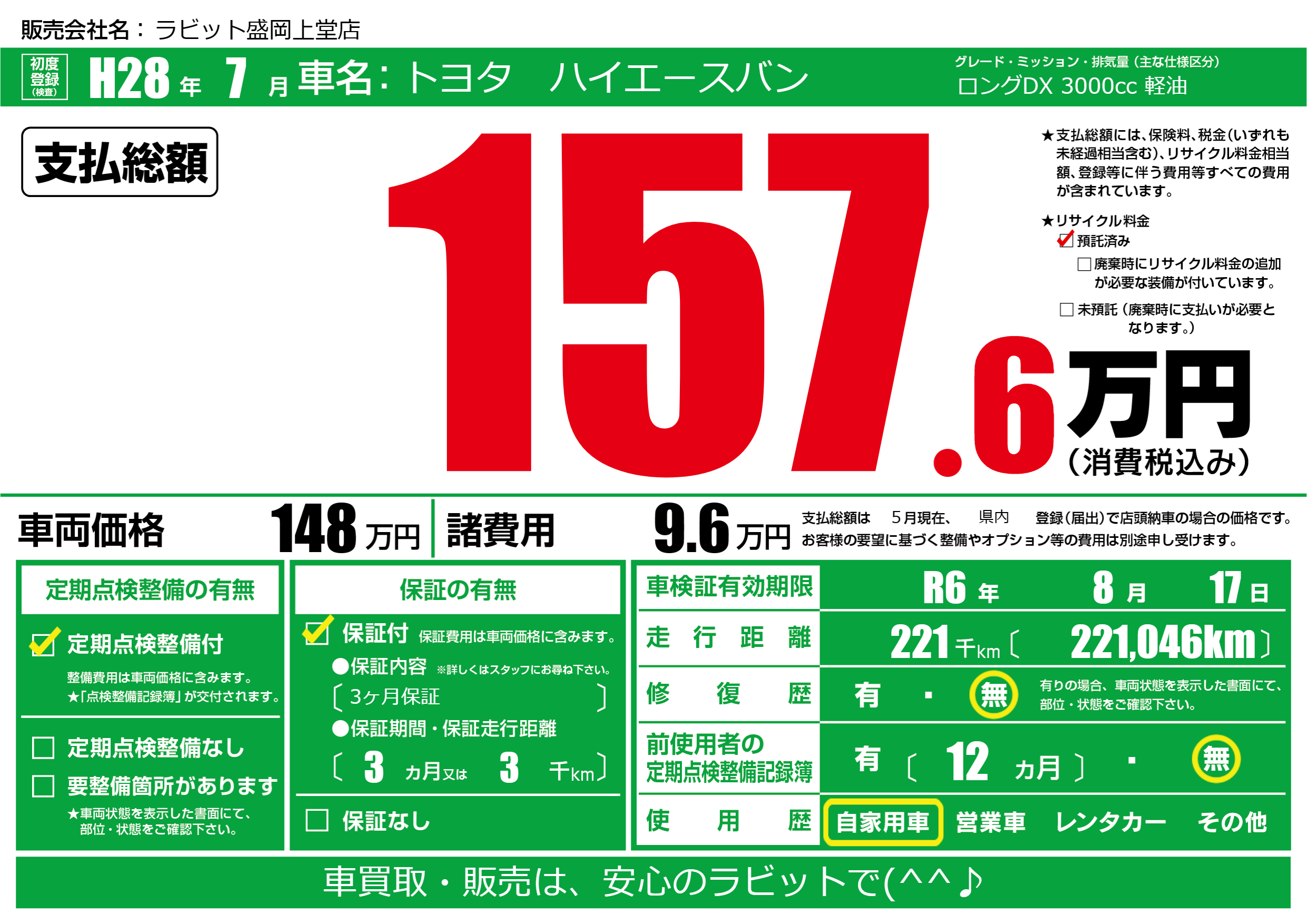 | 走行キロ | 22.1万km | 初年度登録 | H28年7月 |