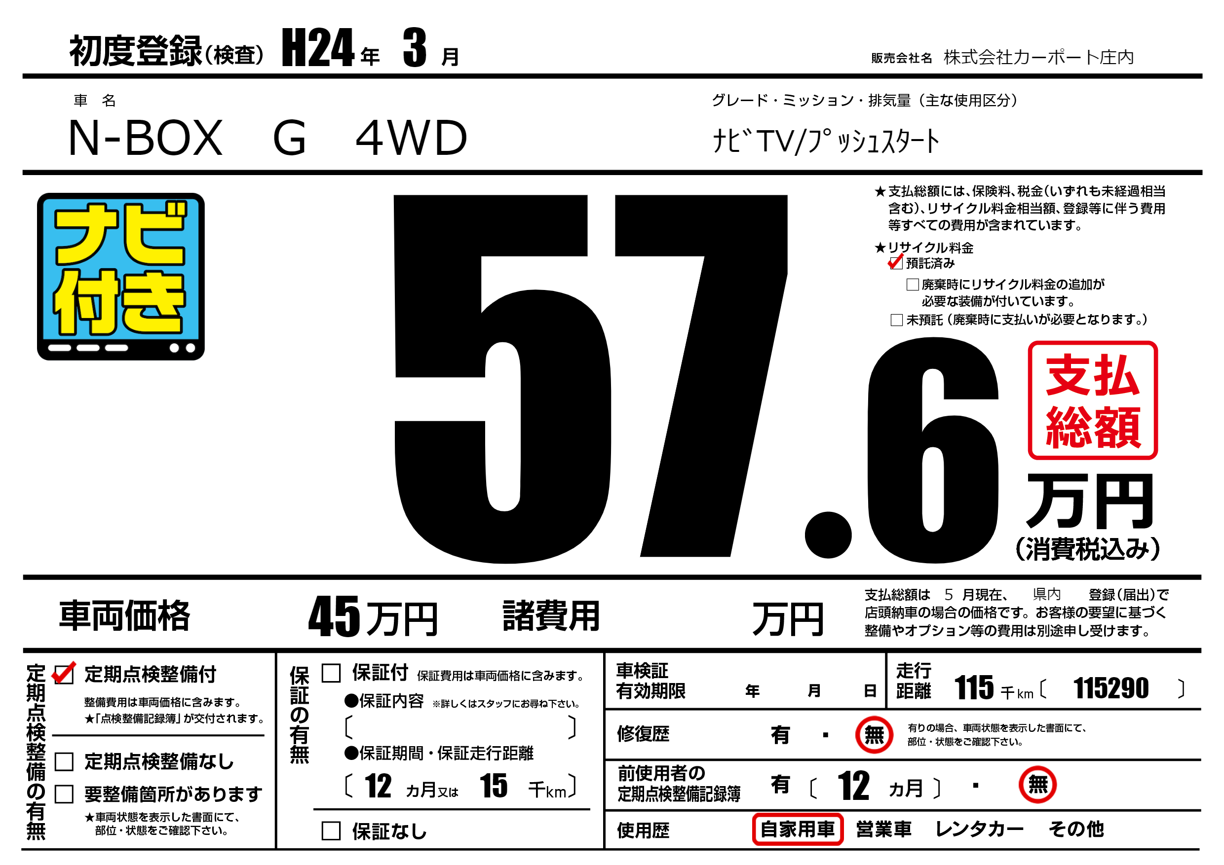 | 車名 | N-BOX G 4WD | グレード ミッション 排気量 |