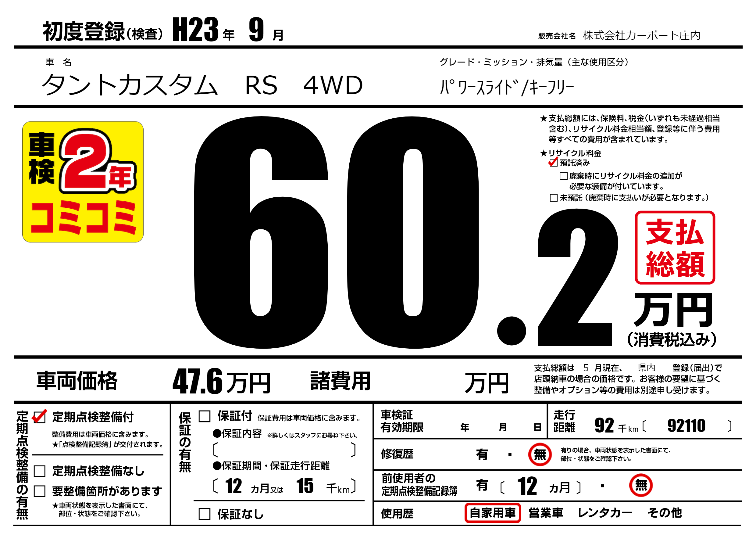 | 走行キロ | 9.2万km | 初年度登録 | H23年9月 |
