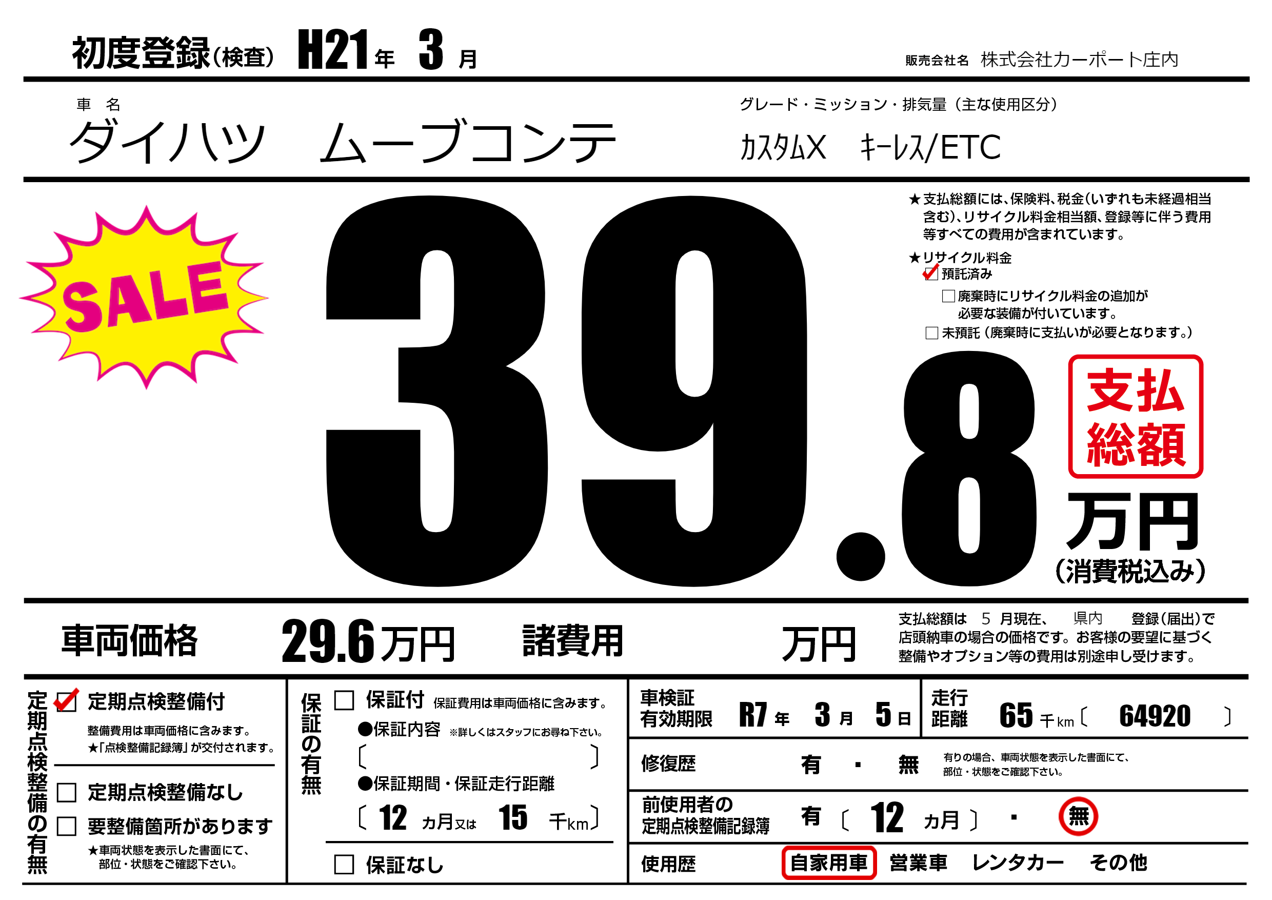 | 車名 | ダイハツ ムーブコンテ | グレード ミッション 排気量 |