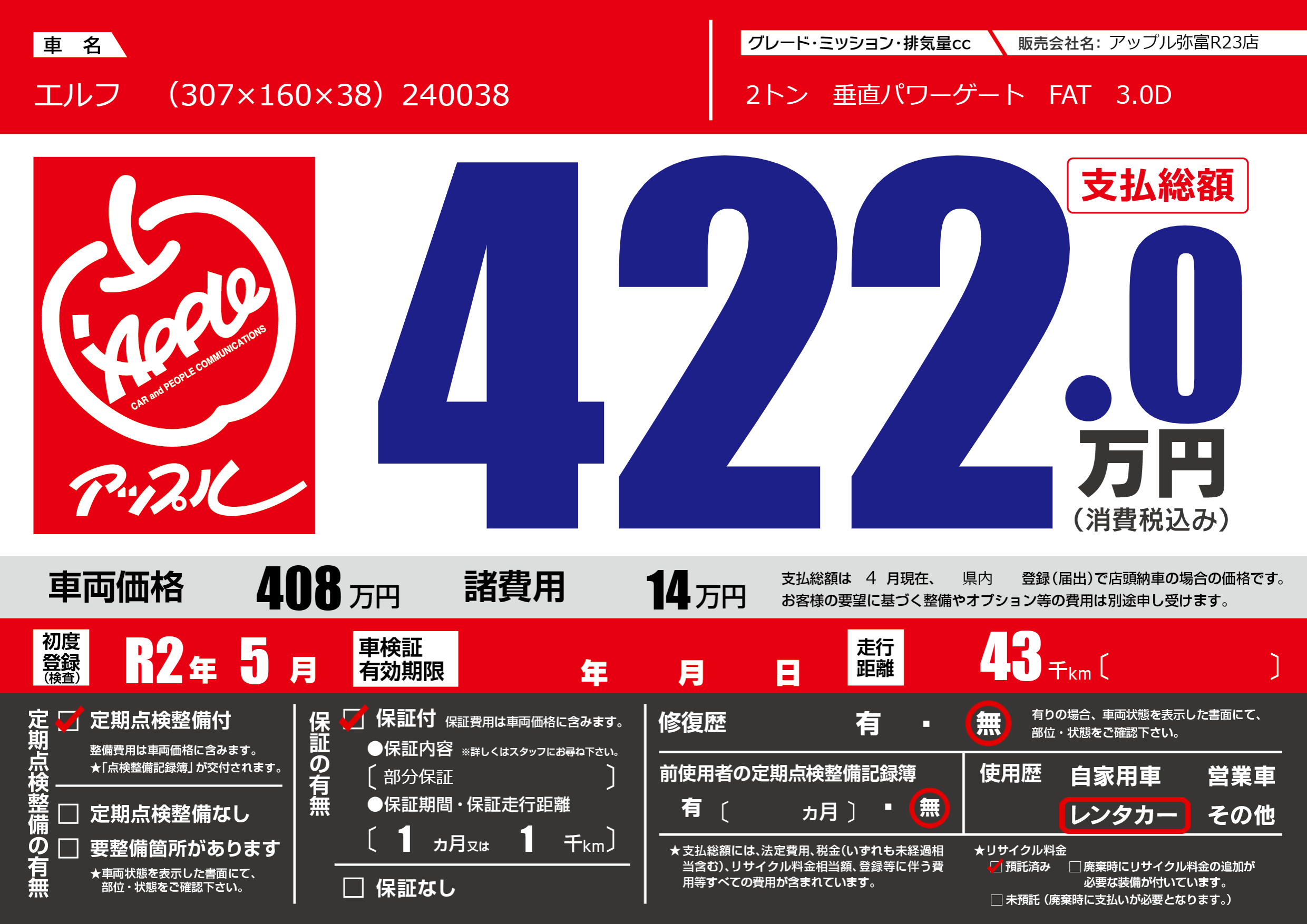 | 車名 | エルフ (307×160×38)240038 | グレード ミッション 排気量 |