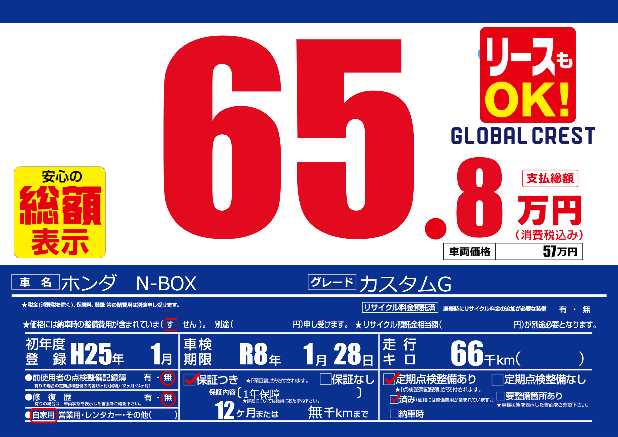 | 走行キロ | 6.6万km | 初年度登録 | H25年1月 |