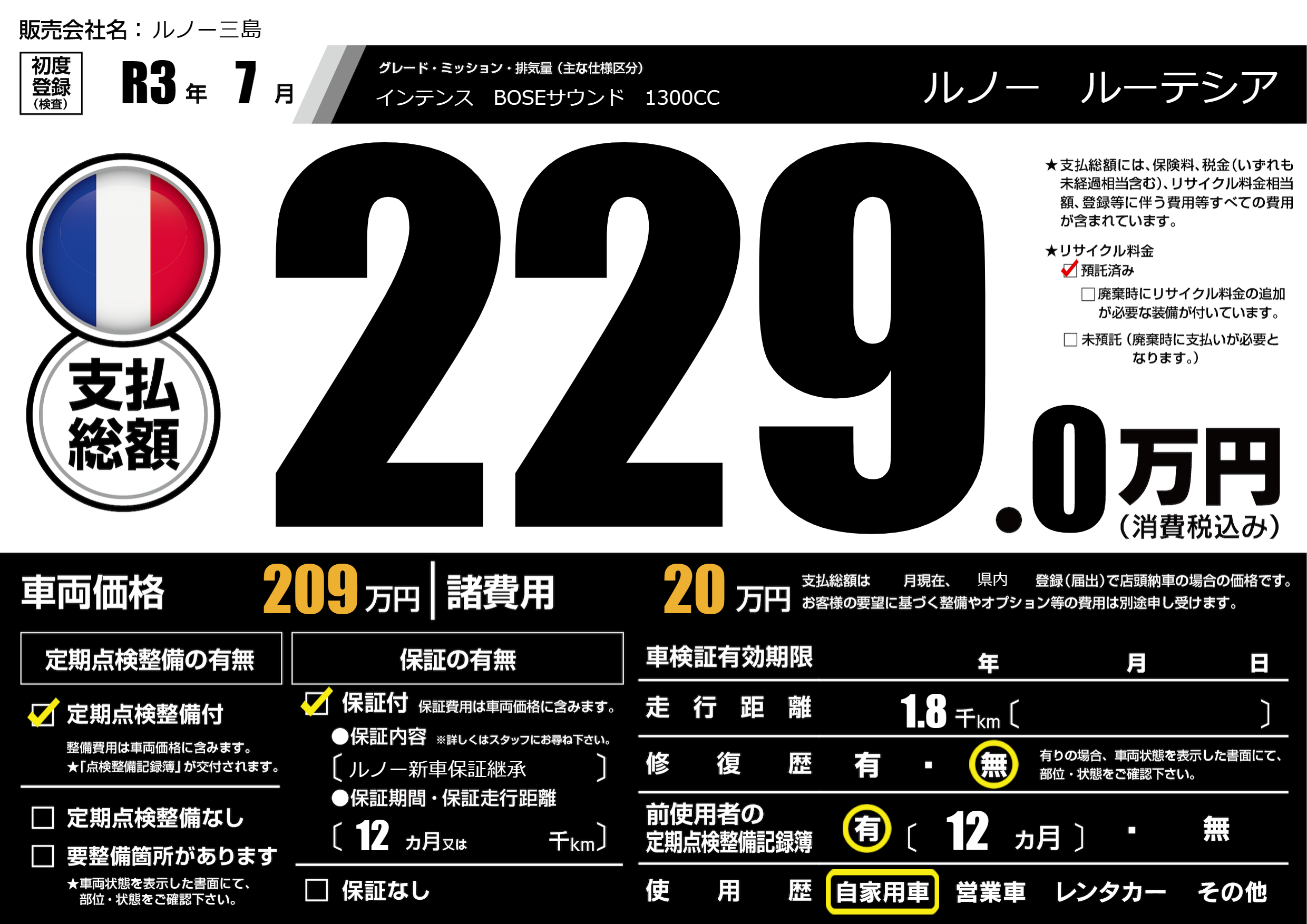 保証なし 保証内容(ルノー新車保証継承) 12ヶ月または千km |