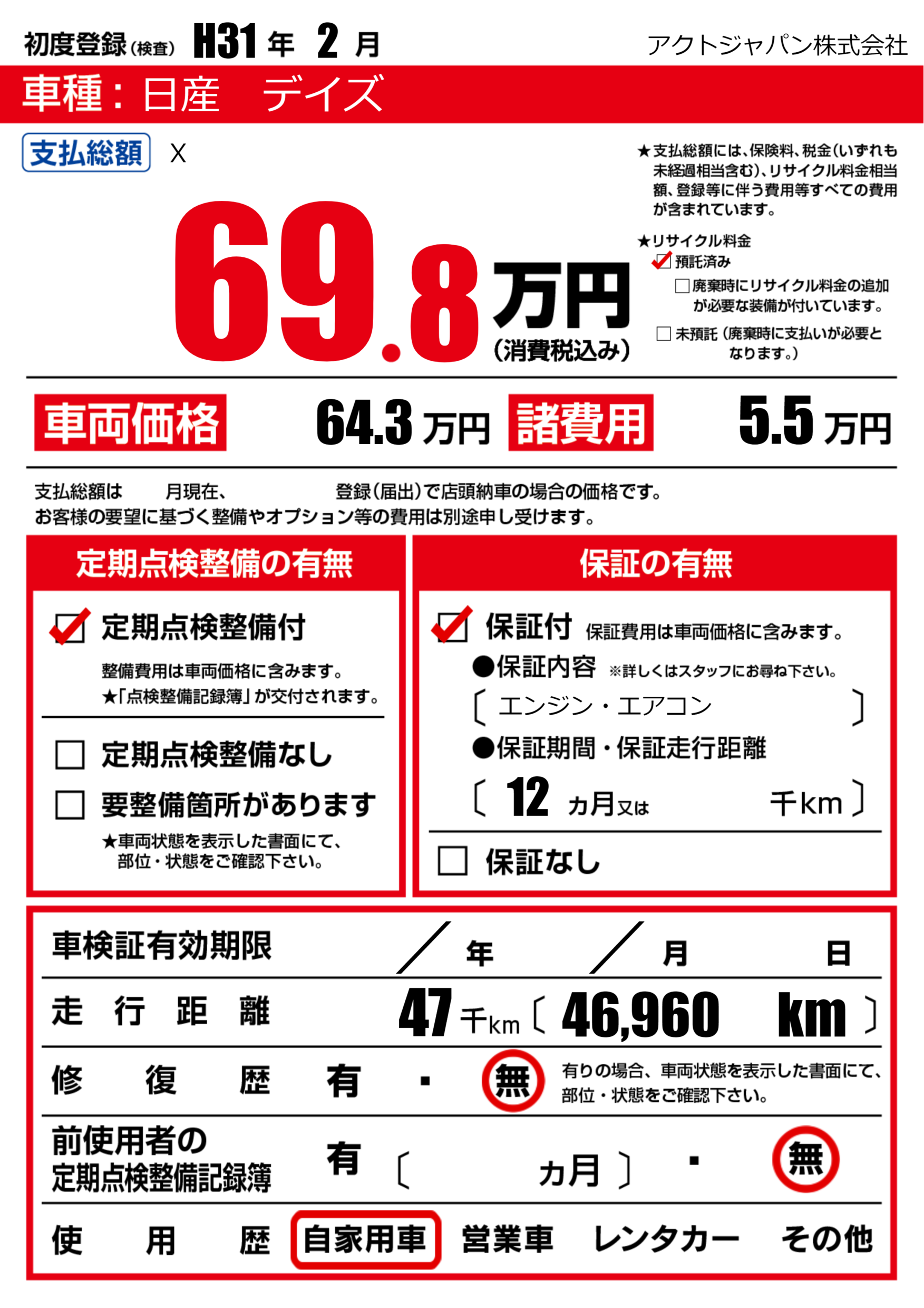 保証なし 保証内容(エンジン・エアコン) 12ヶ月または千km |