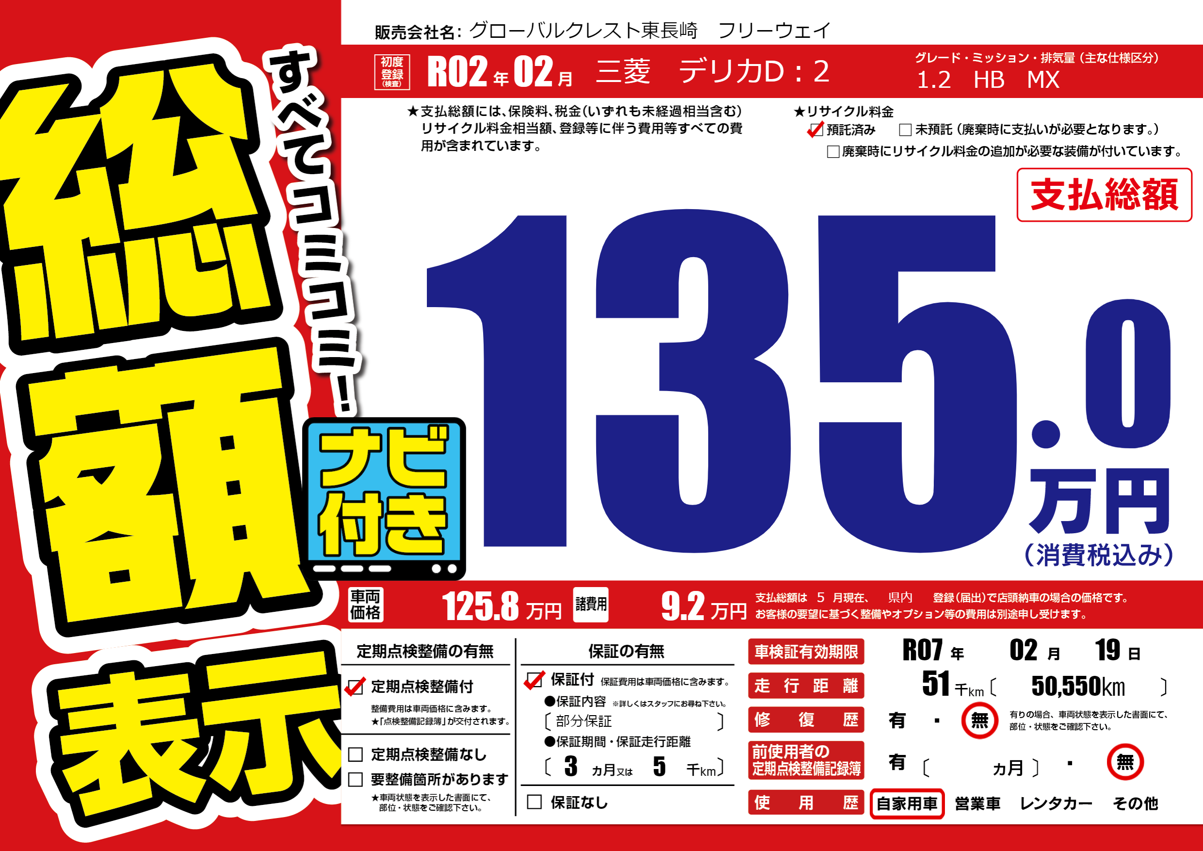 | 車名 | 三菱 デリカD:2 | グレード ミッション 排気量 |