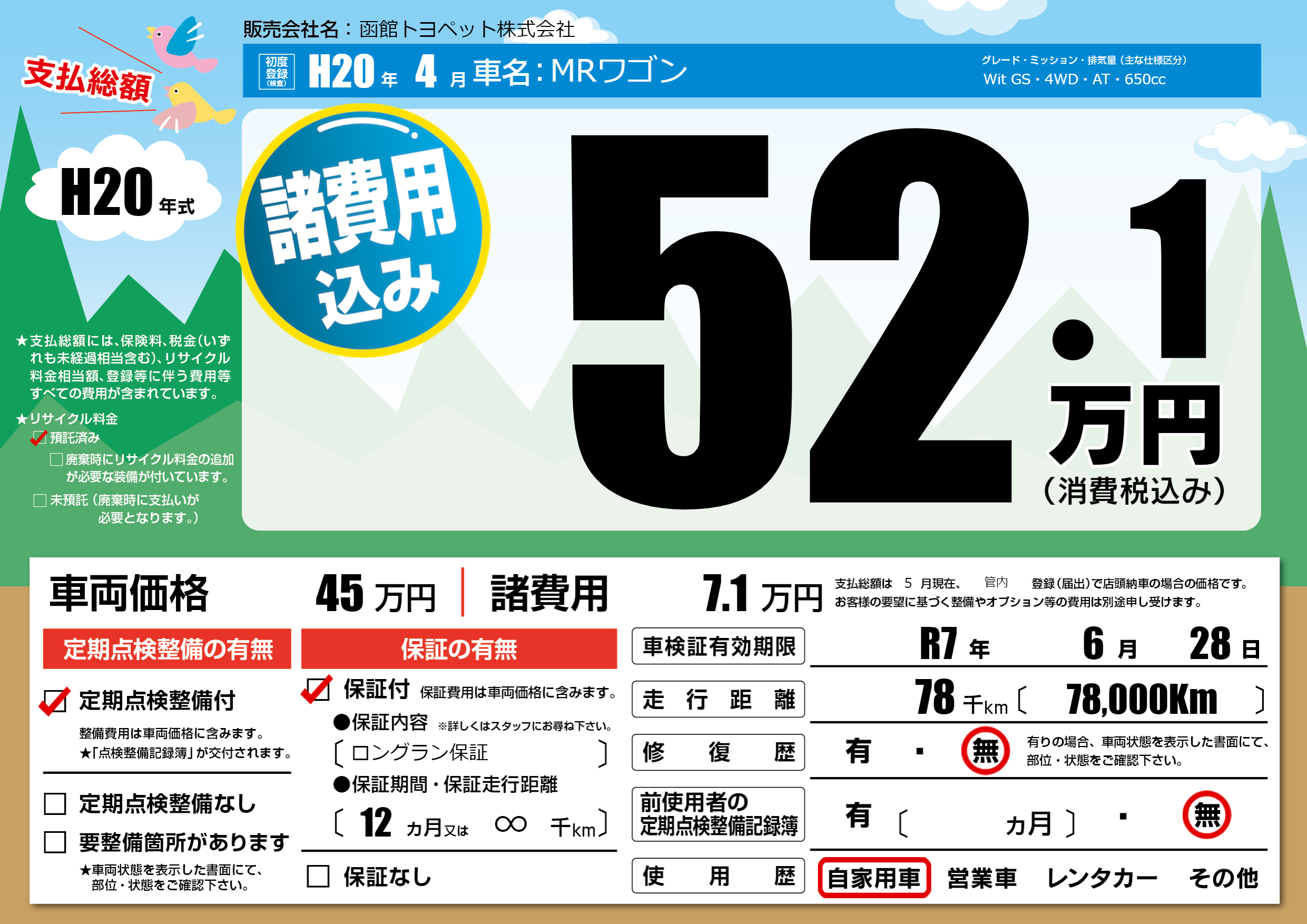 | 走行キロ | 7.8万km | 初年度登録 | H20年4月 |