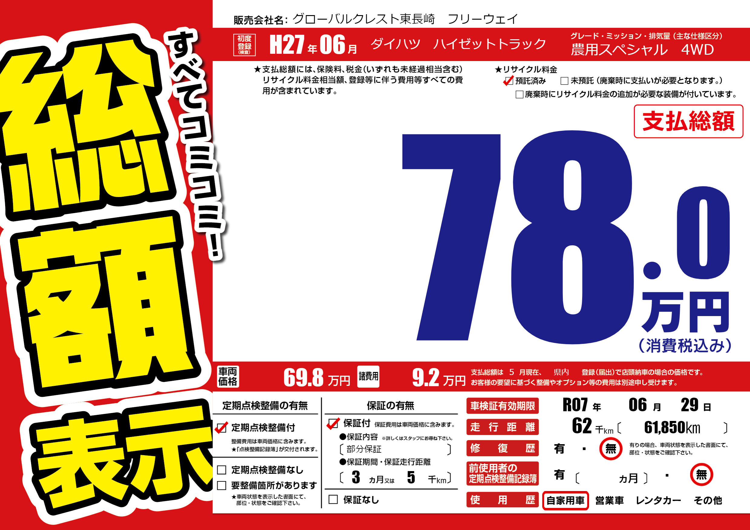 | 走行キロ | 6.2万km | 初年度登録 | H27年06月 |