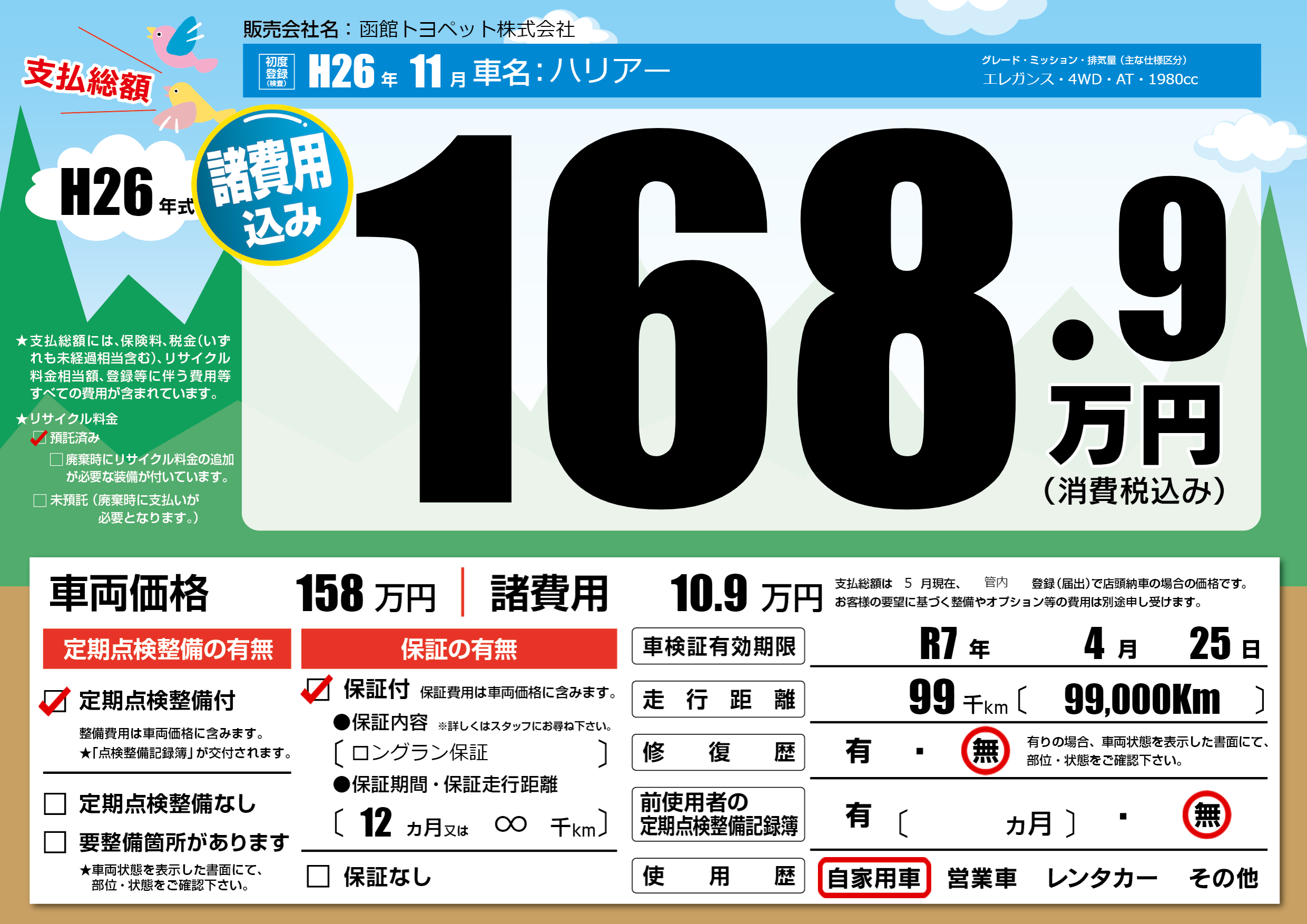 | 走行キロ | 9.9万km | 初年度登録 | H26年11月 |