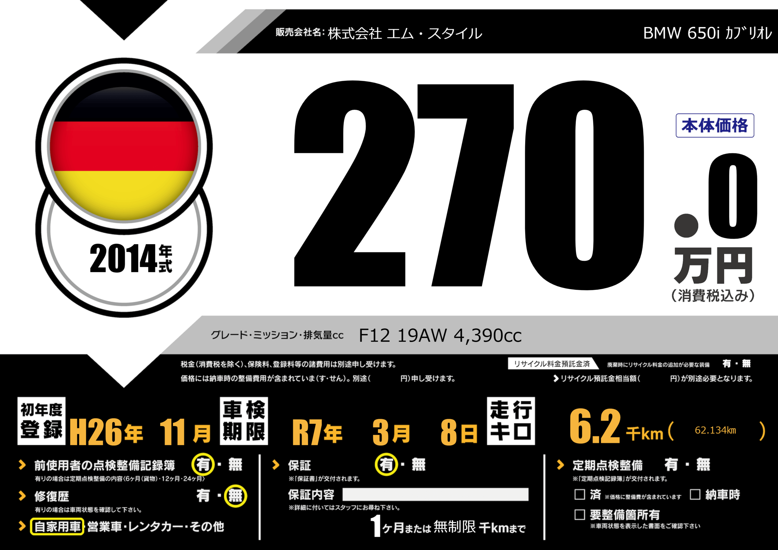 | 車名 | BMW 650i カブリオレ | グレード ミッション 排気量 |