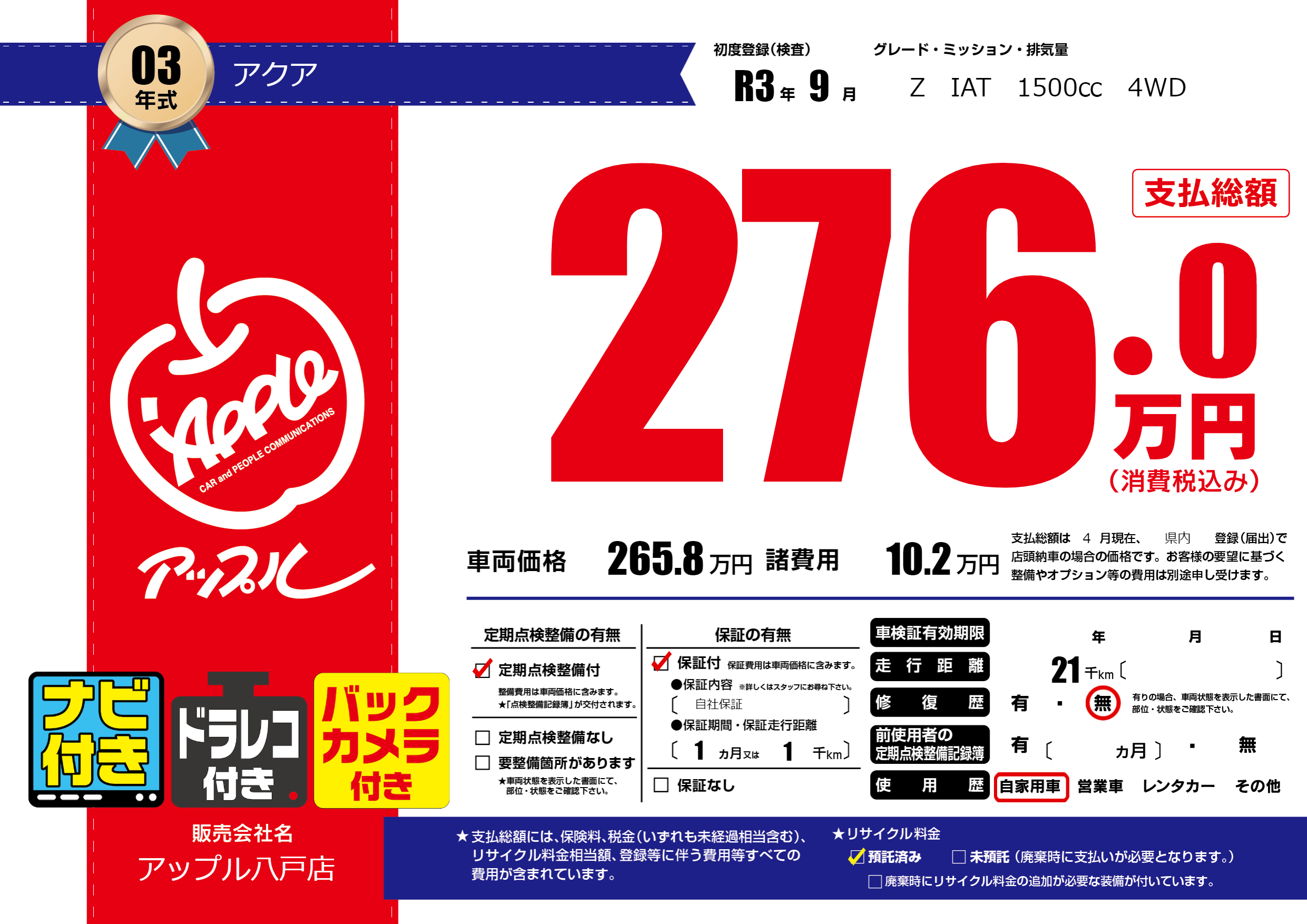 | 走行キロ | 2.1万km | 初年度登録 | R3年9月 |