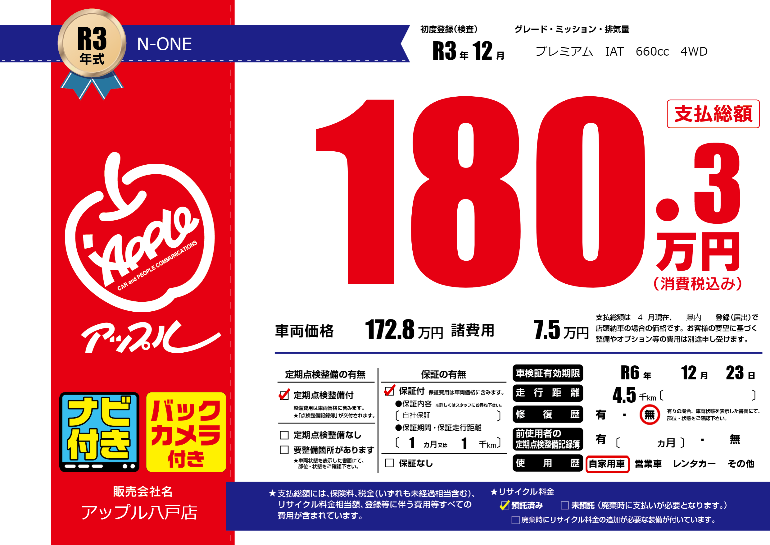 | 車名 | N-ONE | グレード ミッション 排気量 |