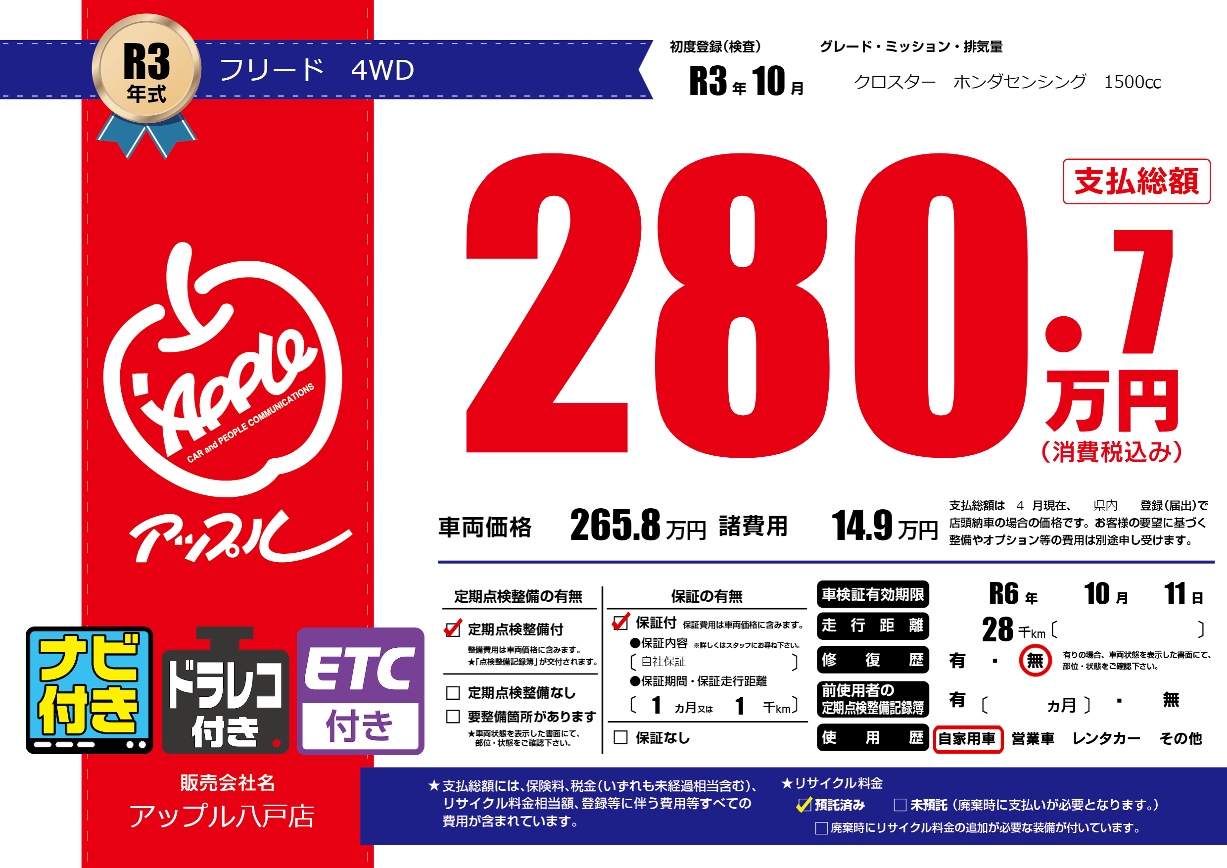 | 車検制限 | R6年 10月 11日 | ||
