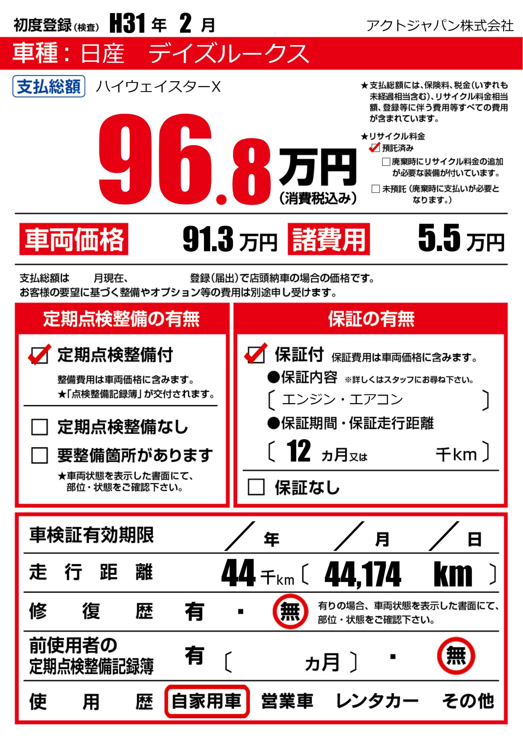 | 車名 | 日産 デイズルークス | グレード ミッション 排気量 |