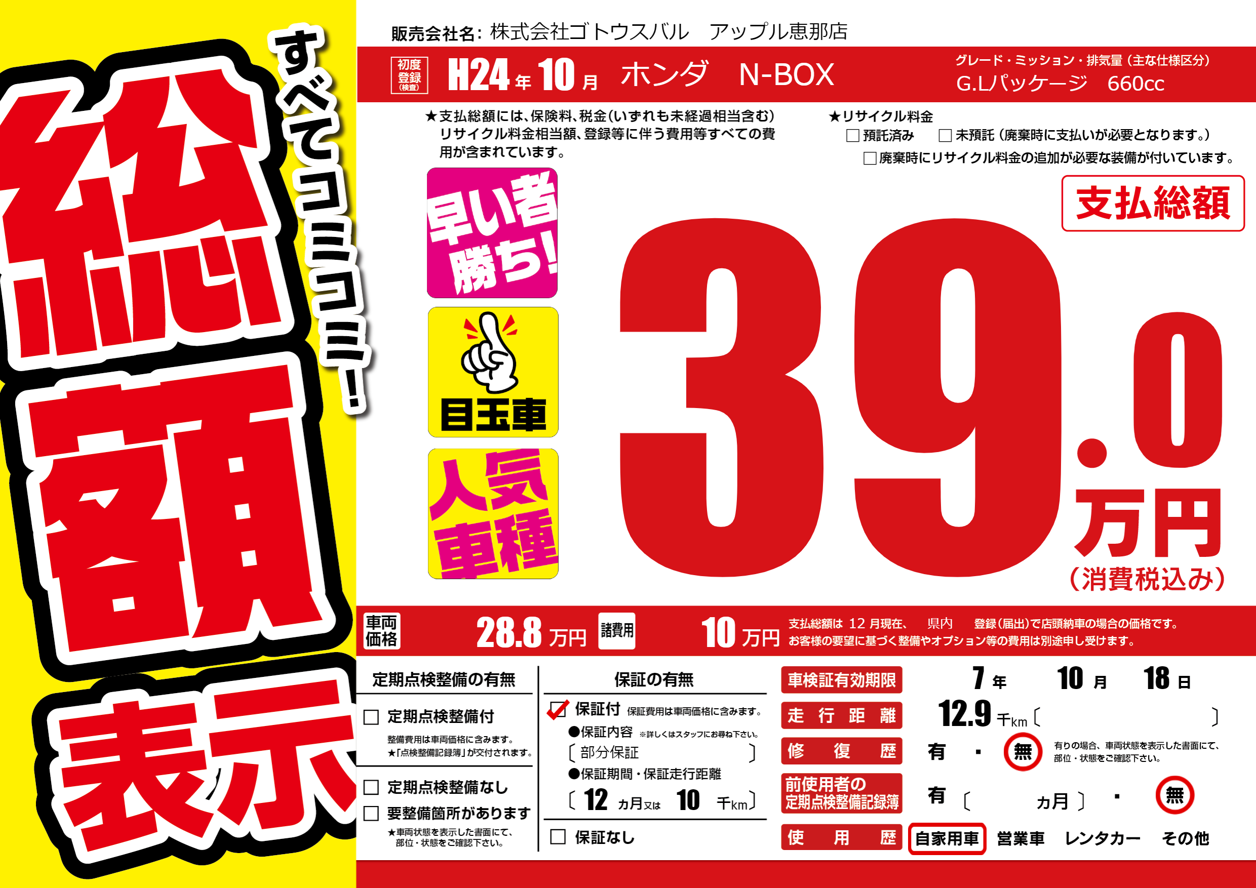 | 車名 | ホンダ N-BOX | グレード ミッション 排気量 |