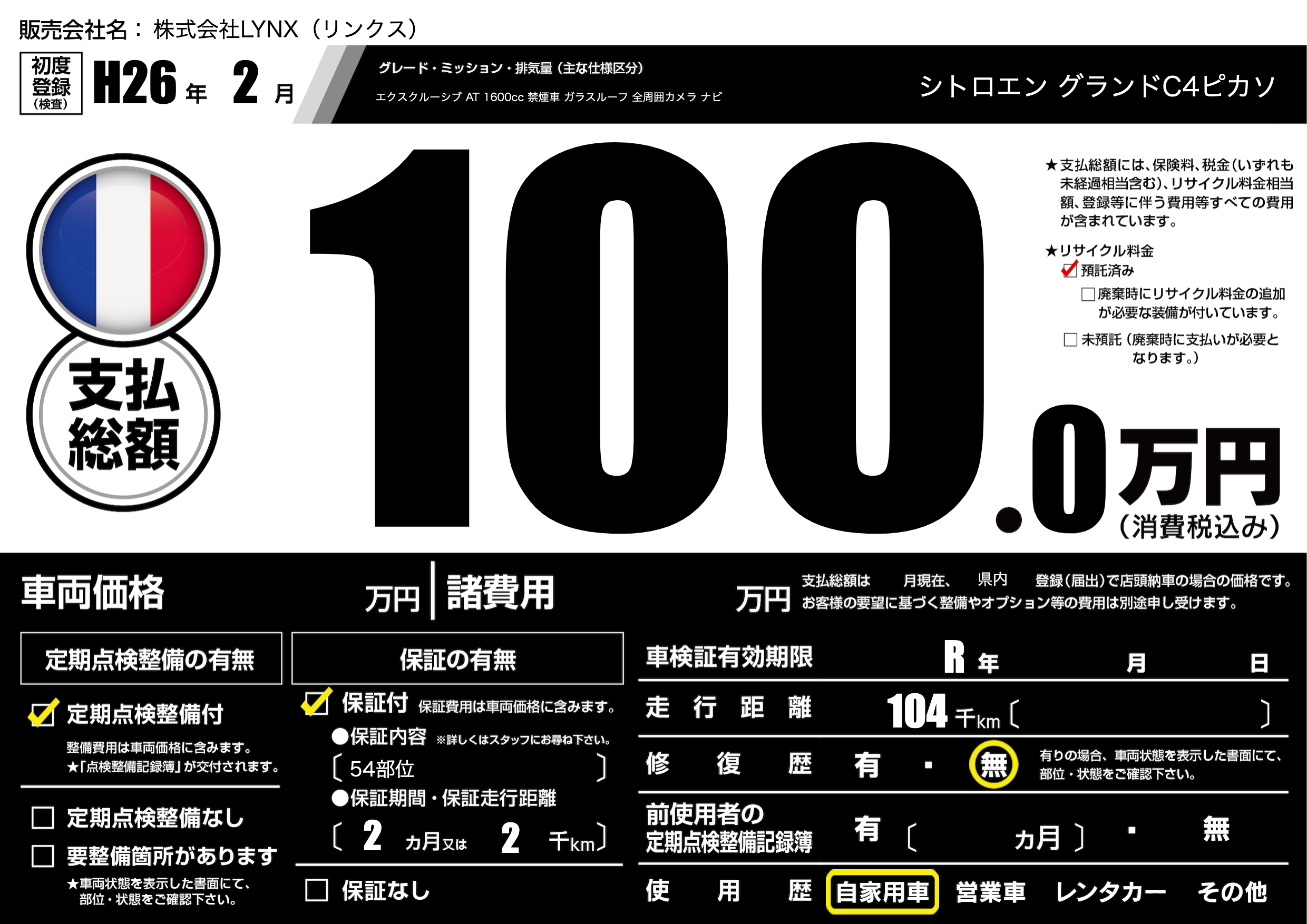 | 車名 | シトロエン グランドC4ピカソ | グレード ミッション 排気量 |