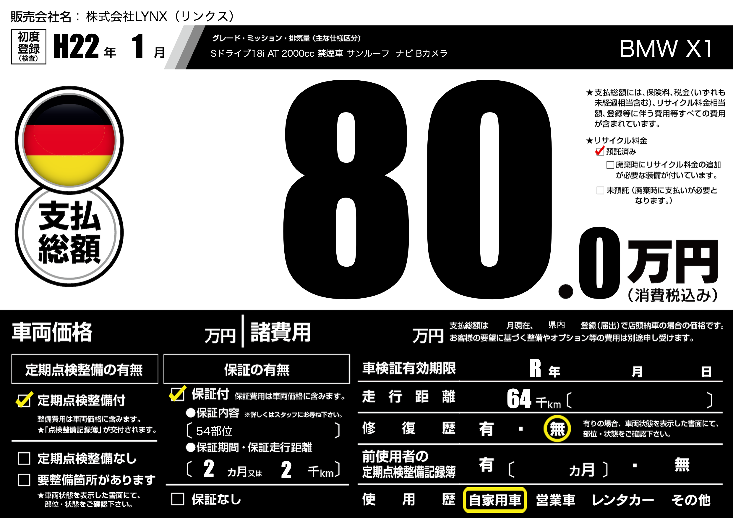 | 車名 | BMW X1 | グレード ミッション 排気量 |