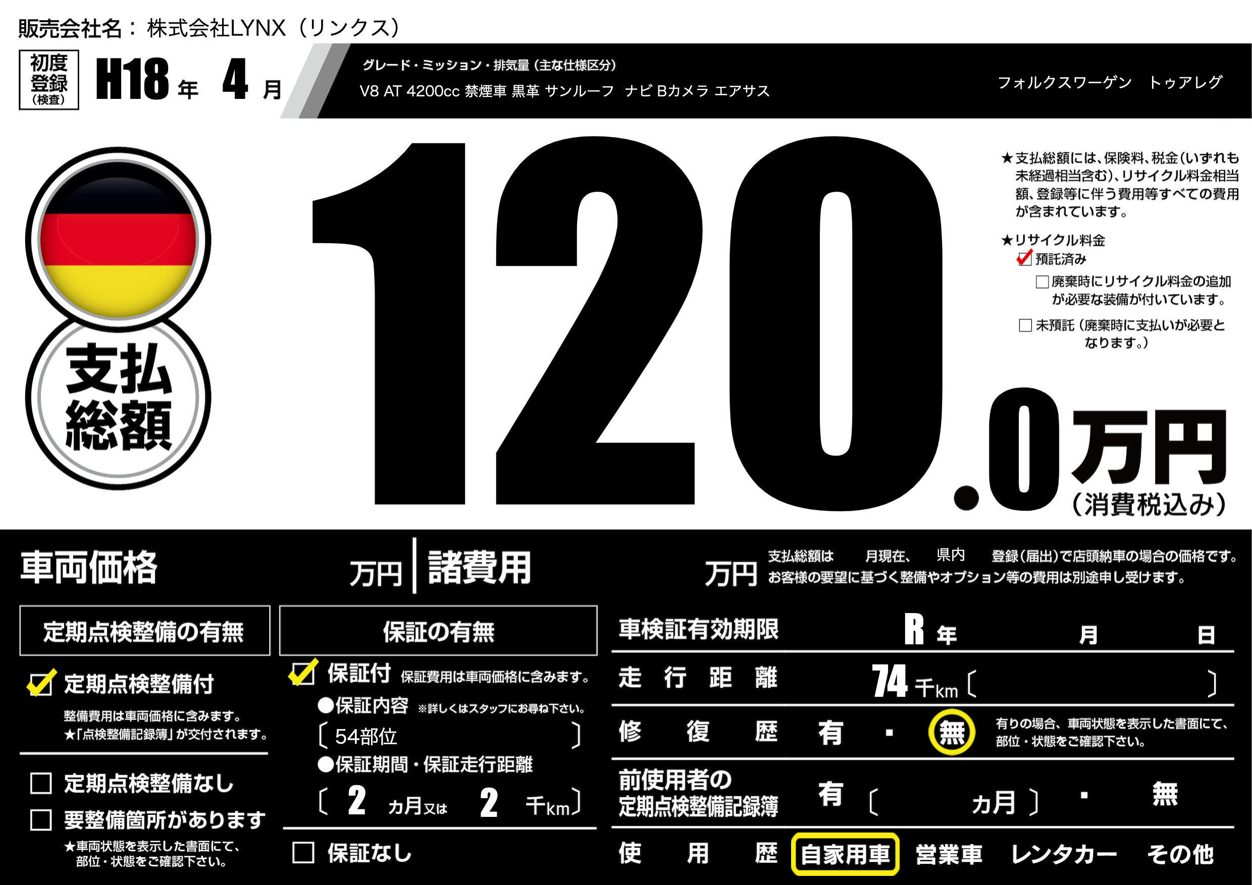 | 車名 | フォルクスワーゲン トゥアレグ | グレード ミッション 排気量 |