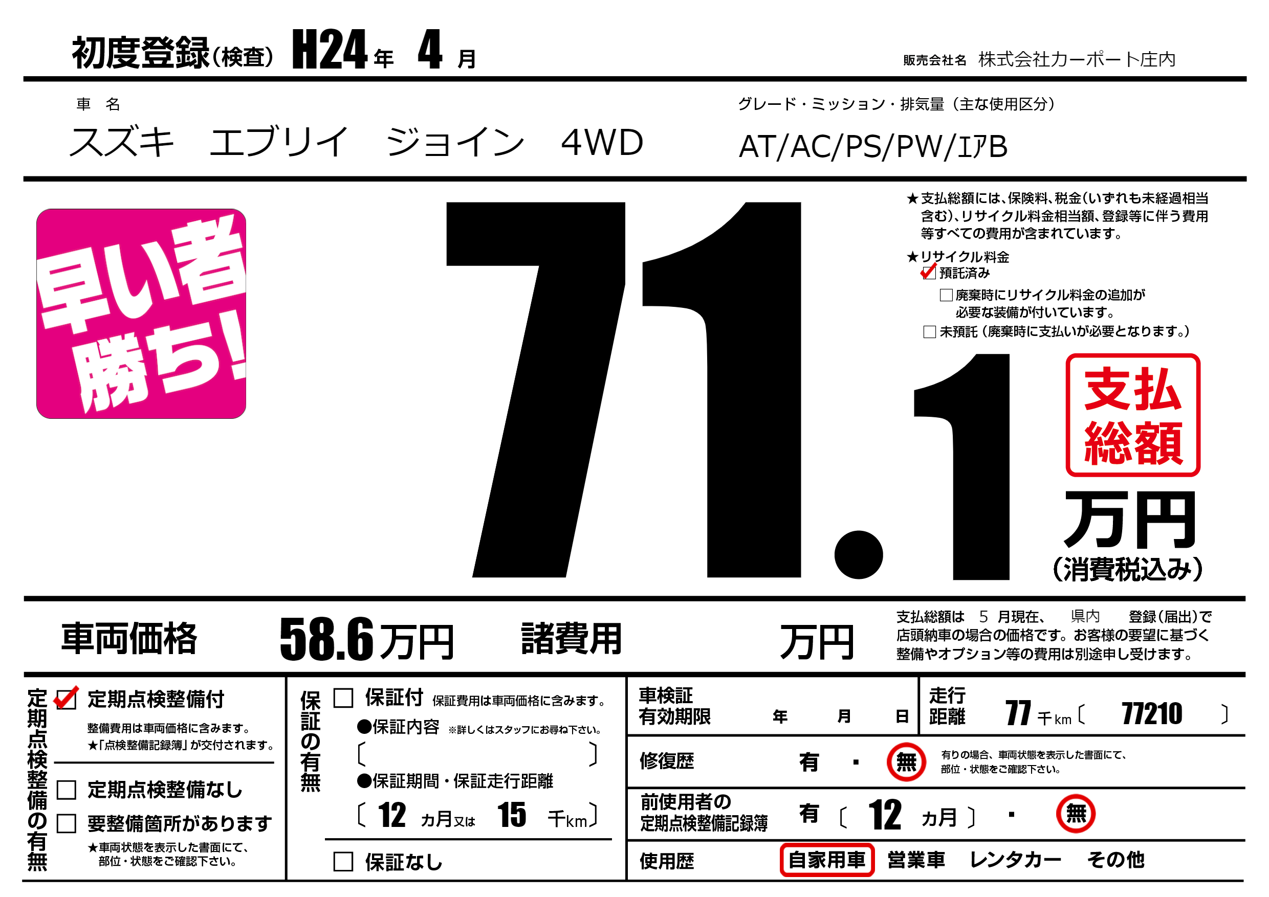 | 走行キロ | 7.7万km | 初年度登録 | H24年4月 |