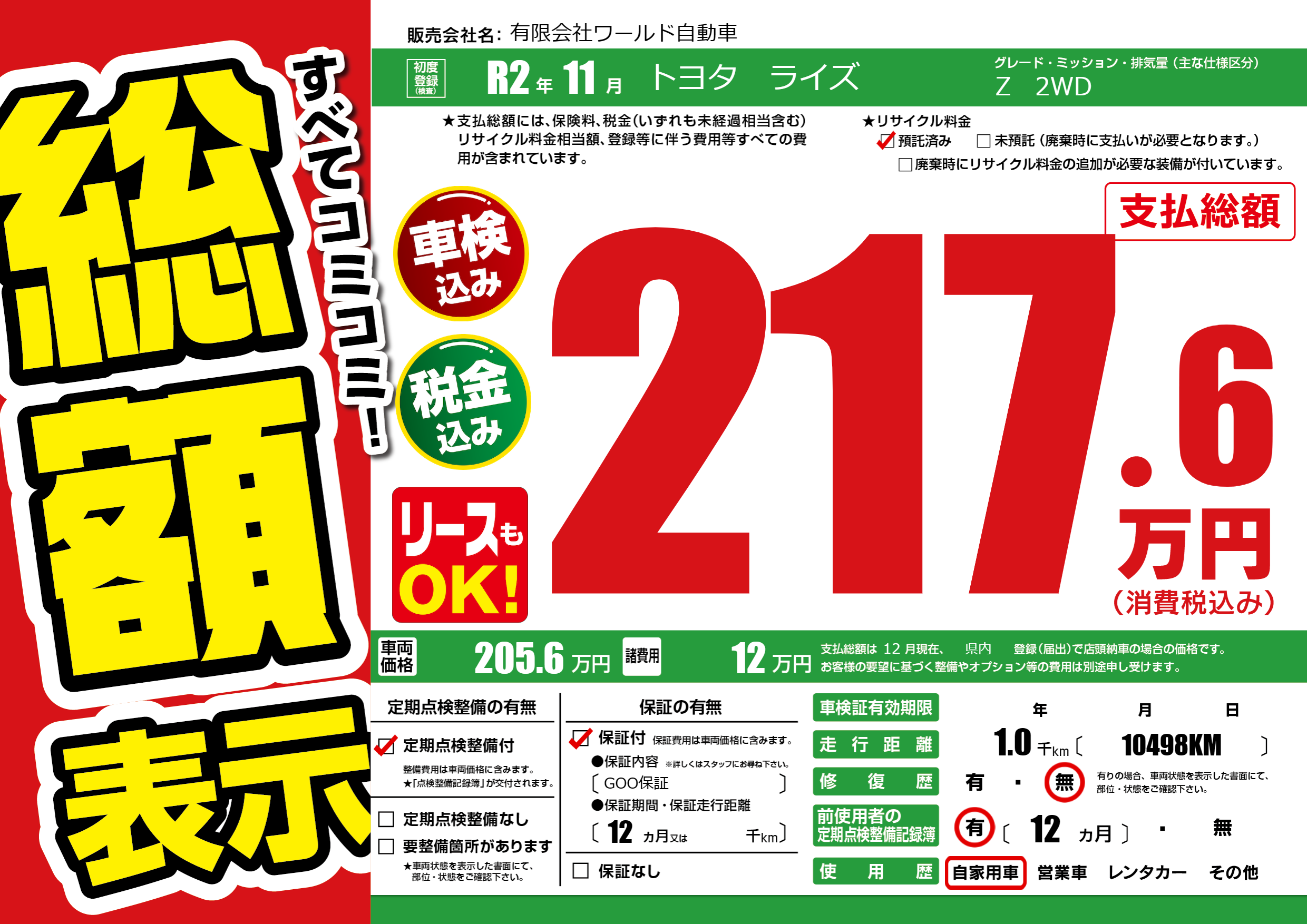 | 車名 | トヨタ ライズ | グレード ミッション 排気量 |