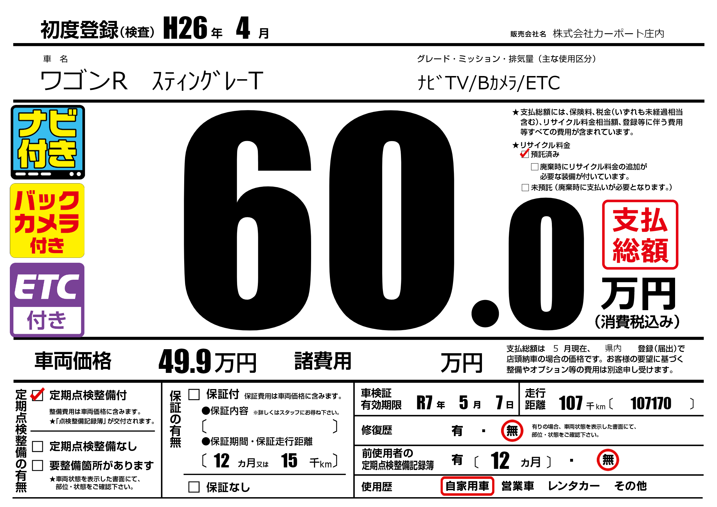 | 走行キロ | 10.7万km | 初年度登録 | H26年4月 |