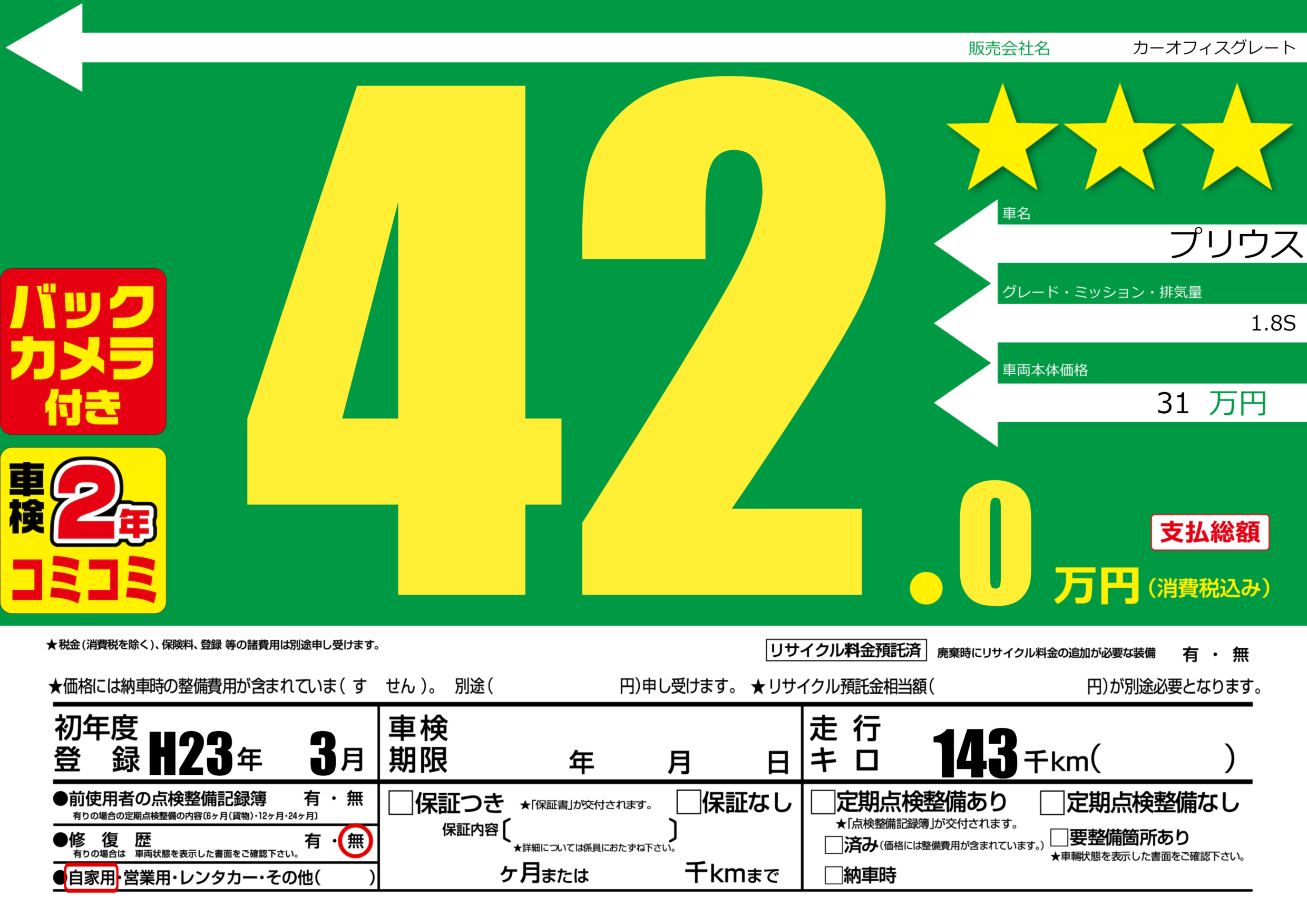 | 車名 | プリウス | グレード ミッション 排気量 |