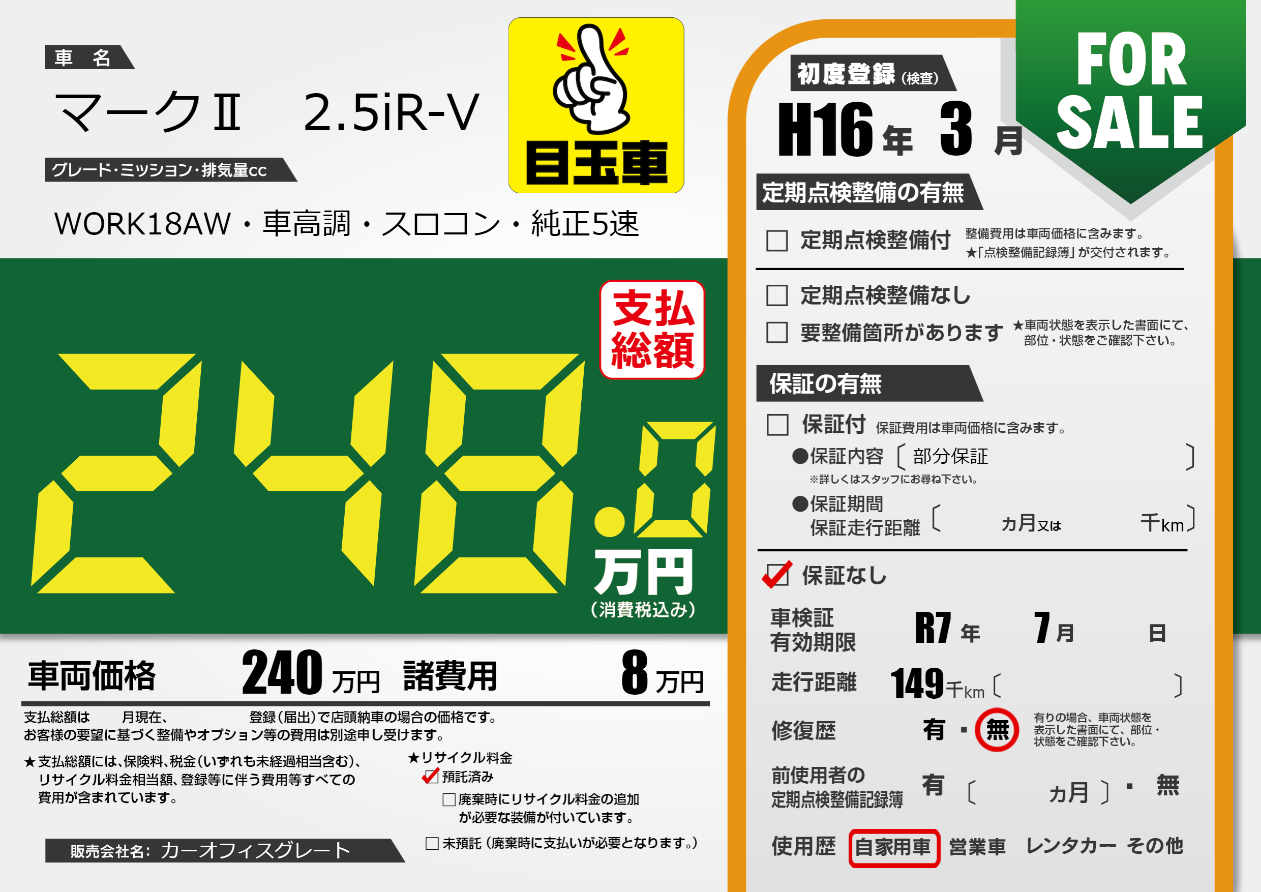 | 車名 | マークⅡ 2.5iR-V | グレード ミッション 排気量 |