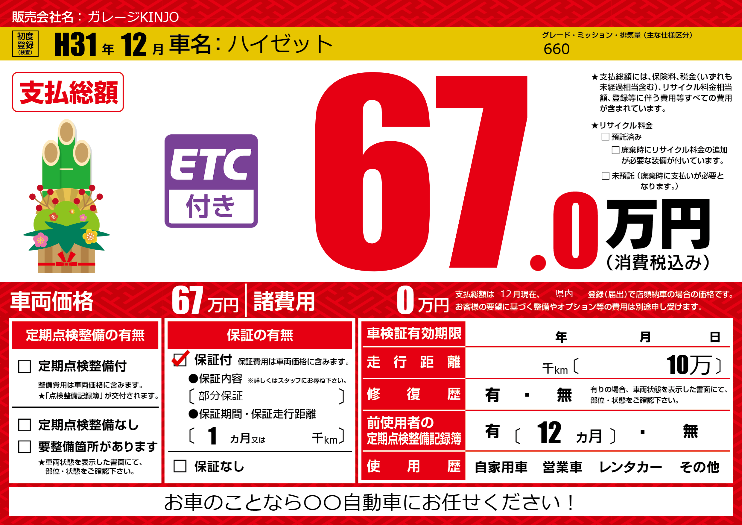 保証付き 保証内容(部分保証) 1ヶ月または()千kmまで |