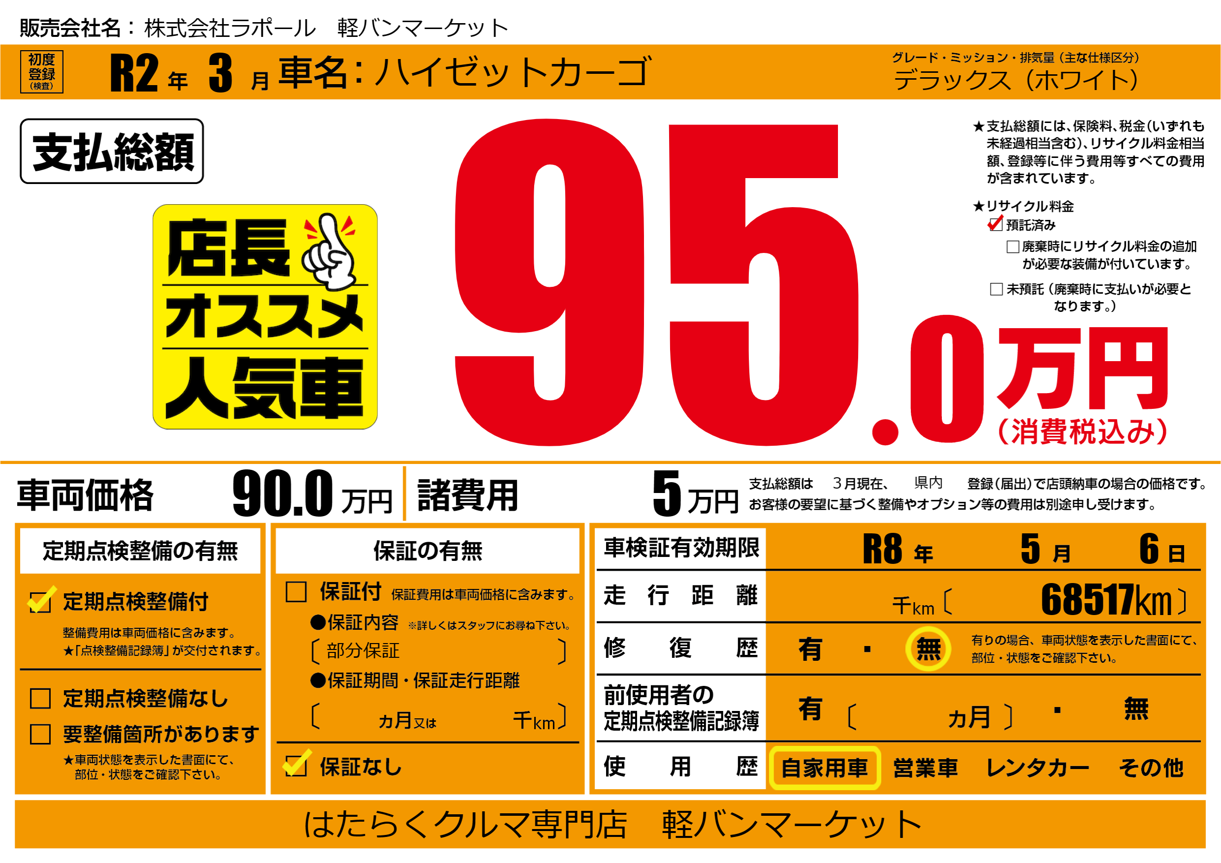 | 車名 | ハイゼットカーゴ | グレード ミッション 排気量 |