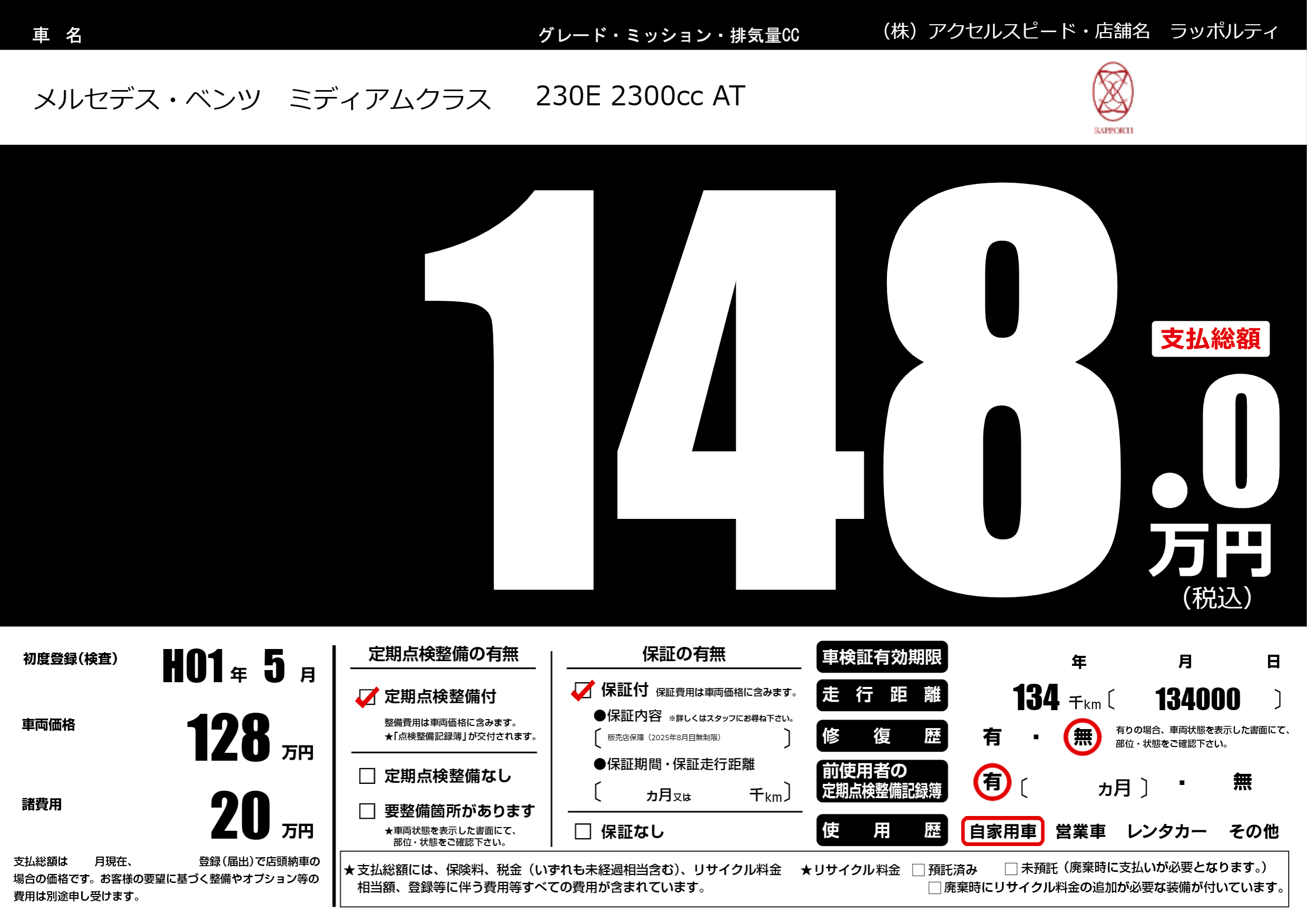 | 走行キロ | 13.4万km | 初年度登録 | H01年5月 |