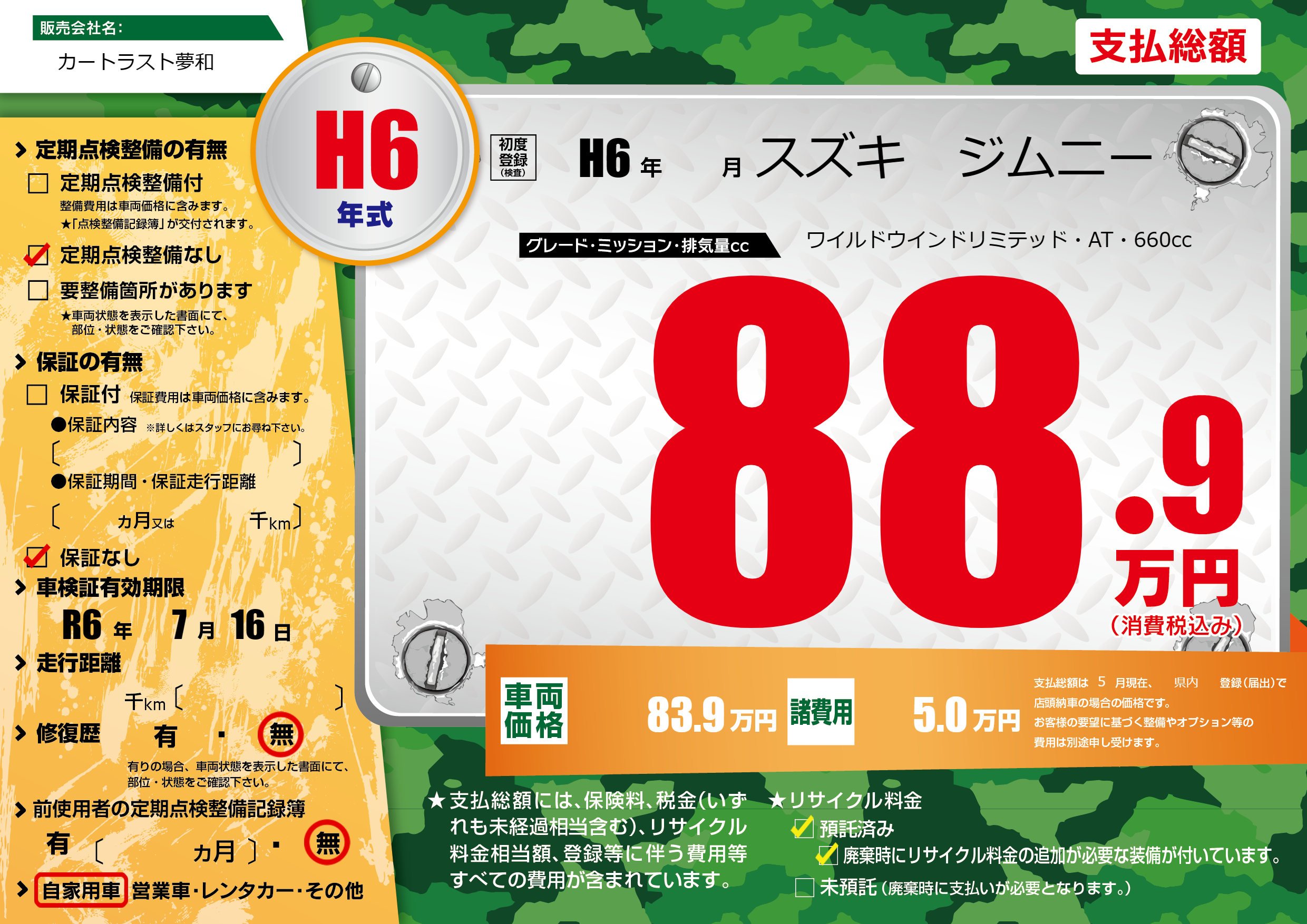 | 車名 | スズキ ジムニー | グレード ミッション 排気量 |
