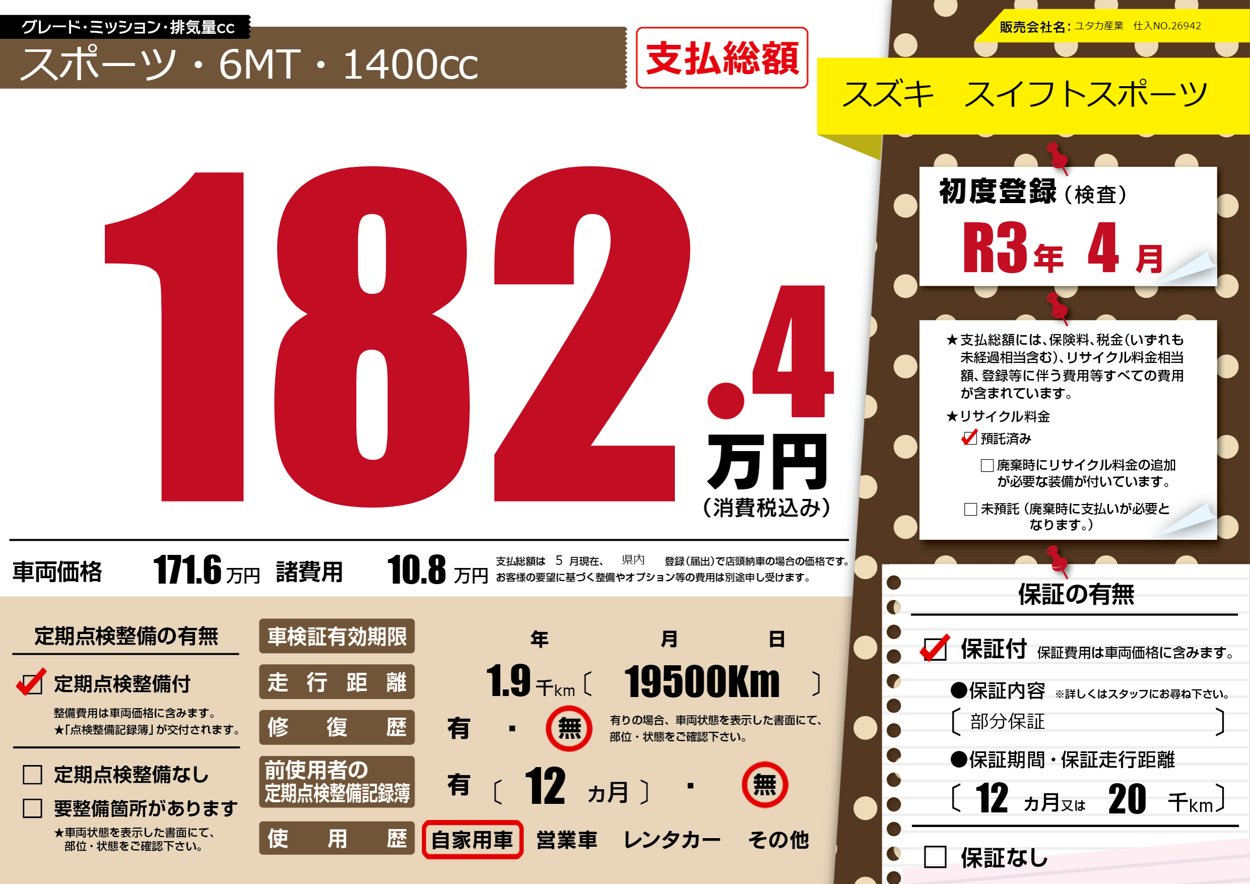 | 車名 | スズキ スイフトスポーツ | グレード ミッション 排気量 |