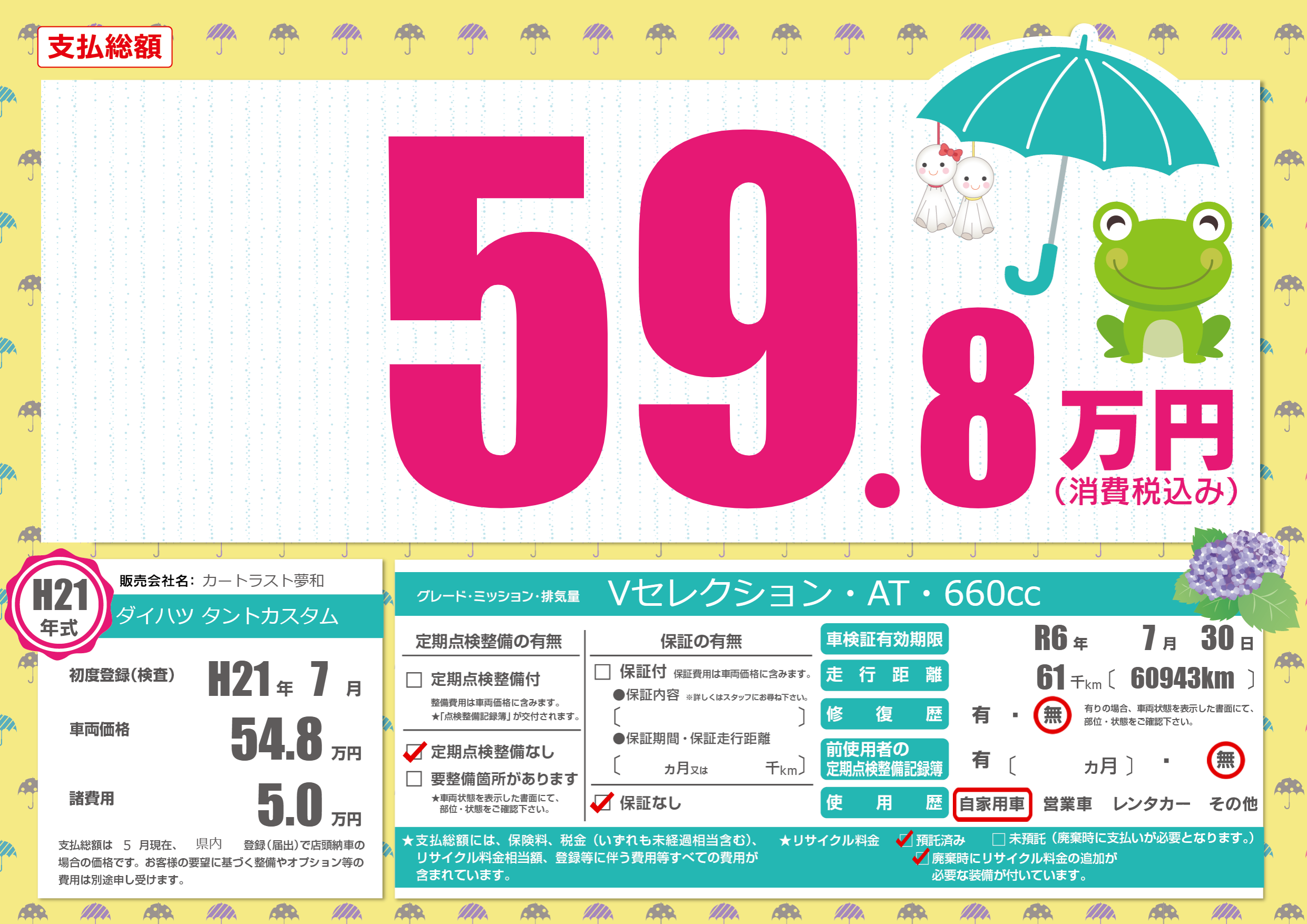 | 車名 | ダイハツ タントカスタム | グレード ミッション 排気量 |