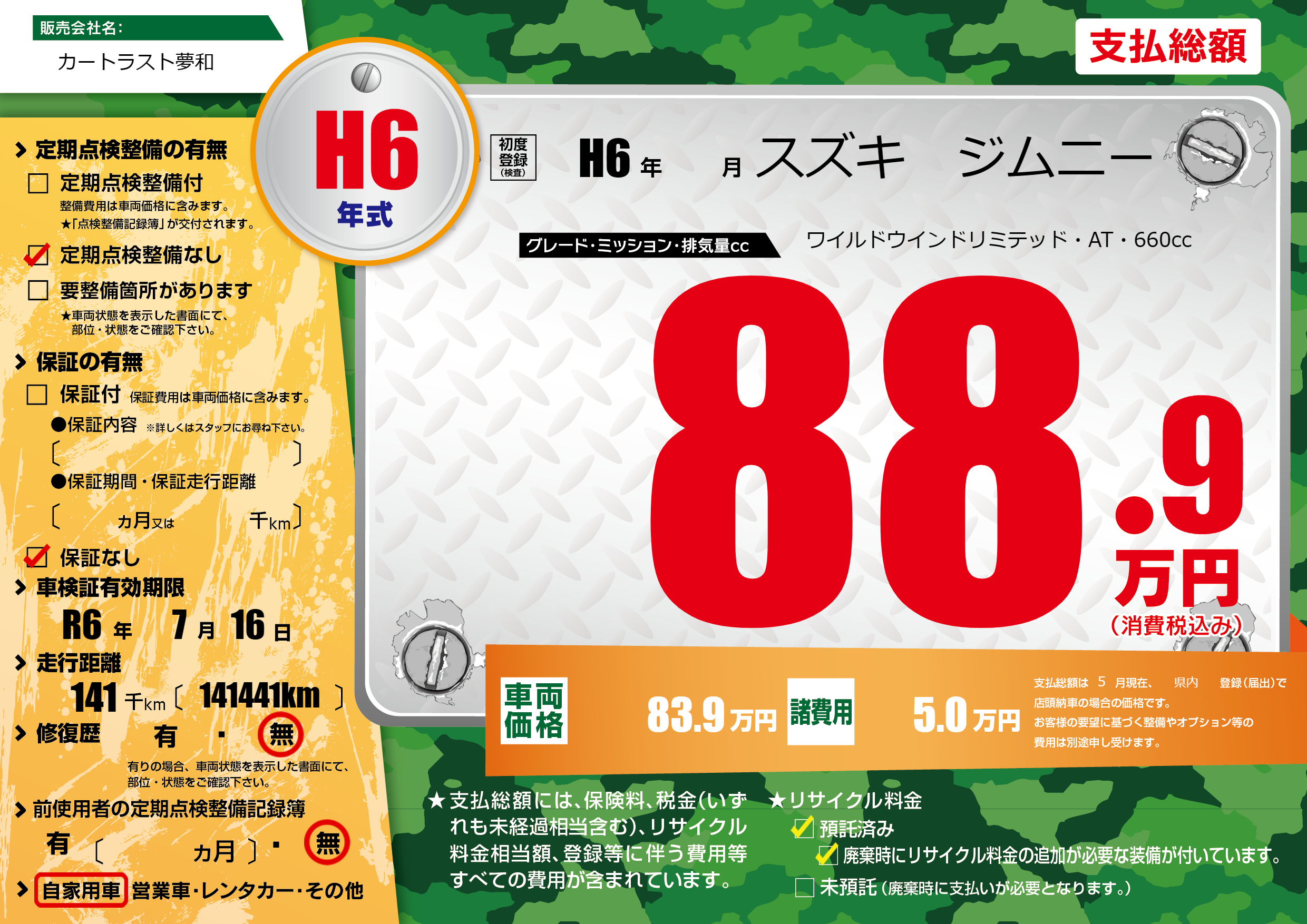 | 車名 | スズキ ジムニー | グレード ミッション 排気量 |