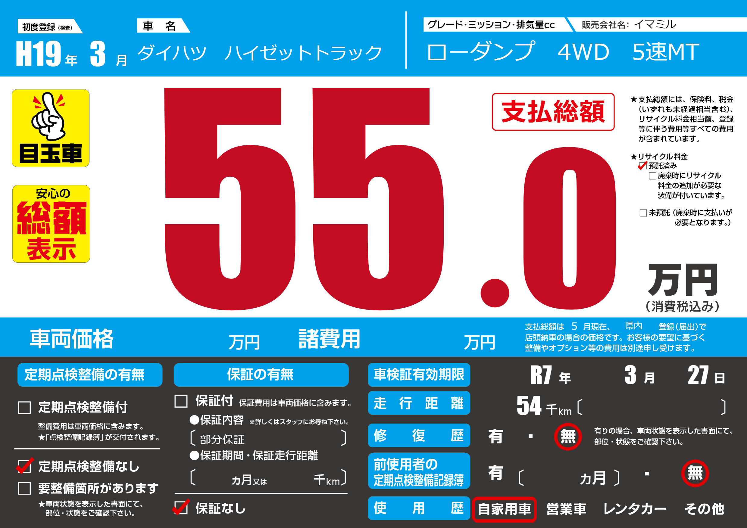 | 走行キロ | 5.4万km | 初年度登録 | H19年3月 |