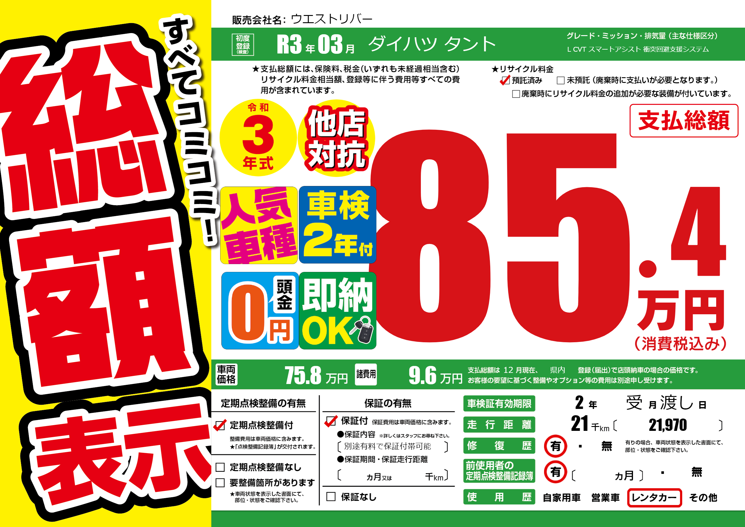 | 走行キロ | 2.1万km | 初年度登録 | R3年03月 |