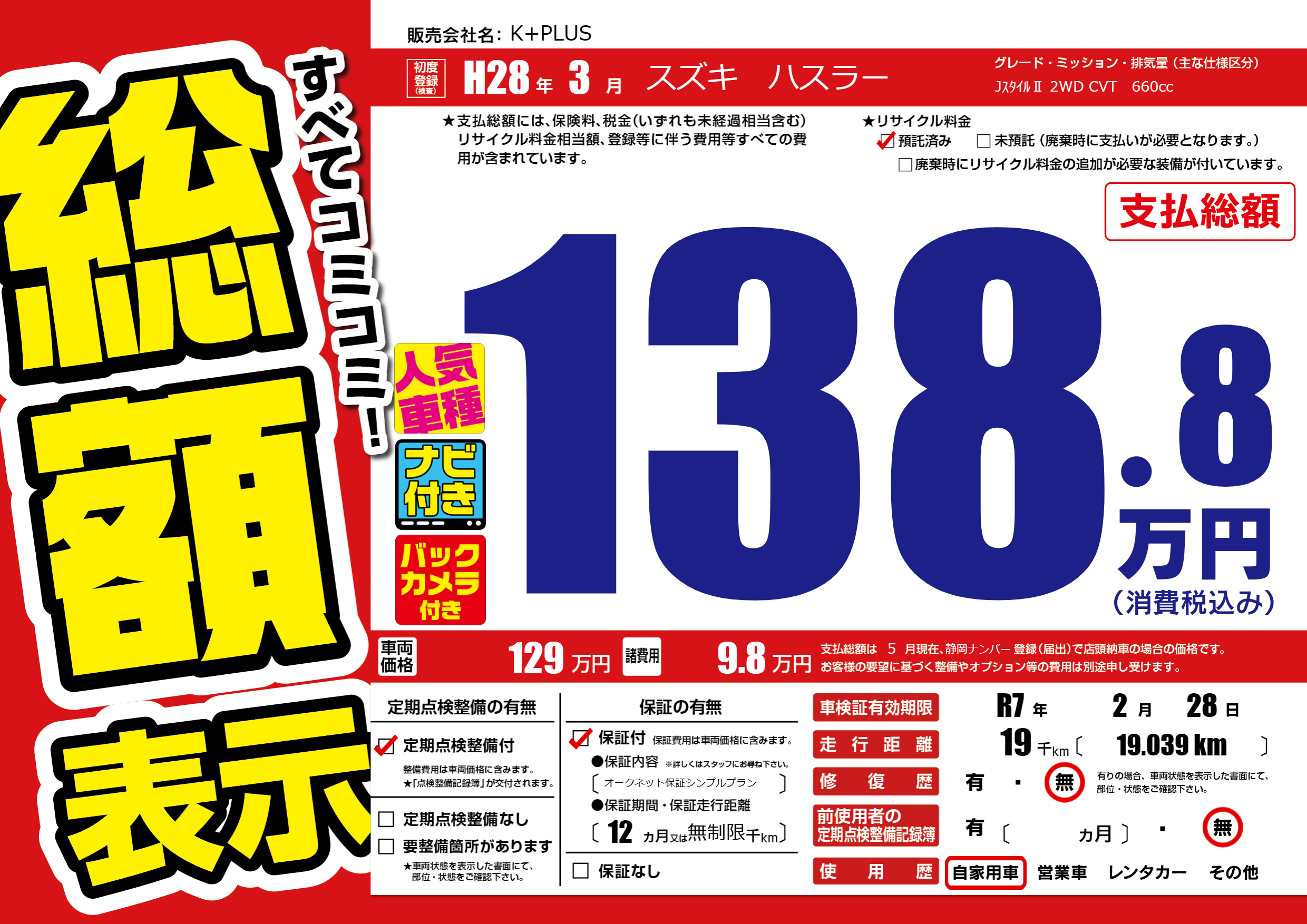 | 車名 | スズキ ハスラー | グレード ミッション 排気量 |