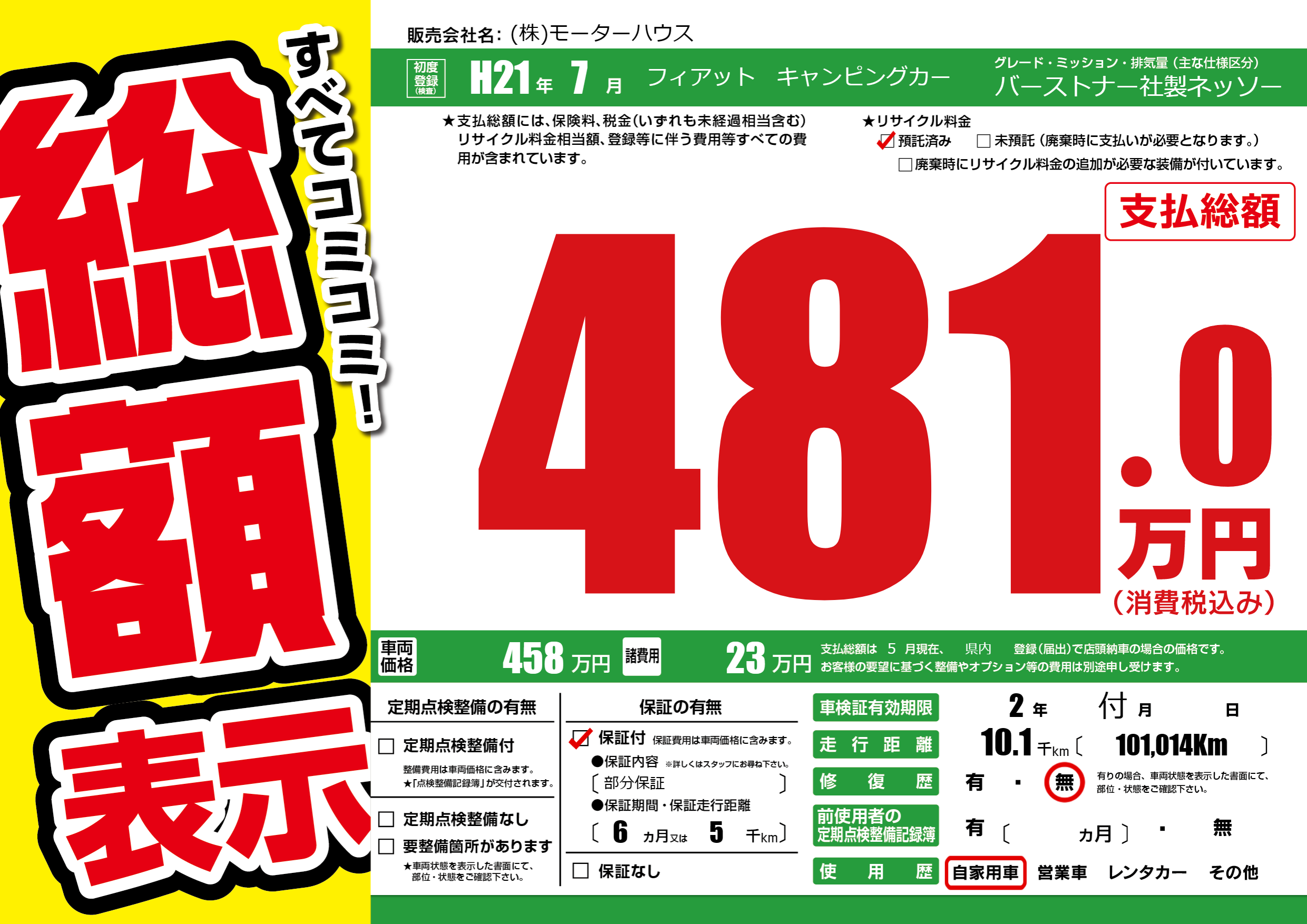 | 車名 | フィアット キャンピングカー | グレード ミッション 排気量 |