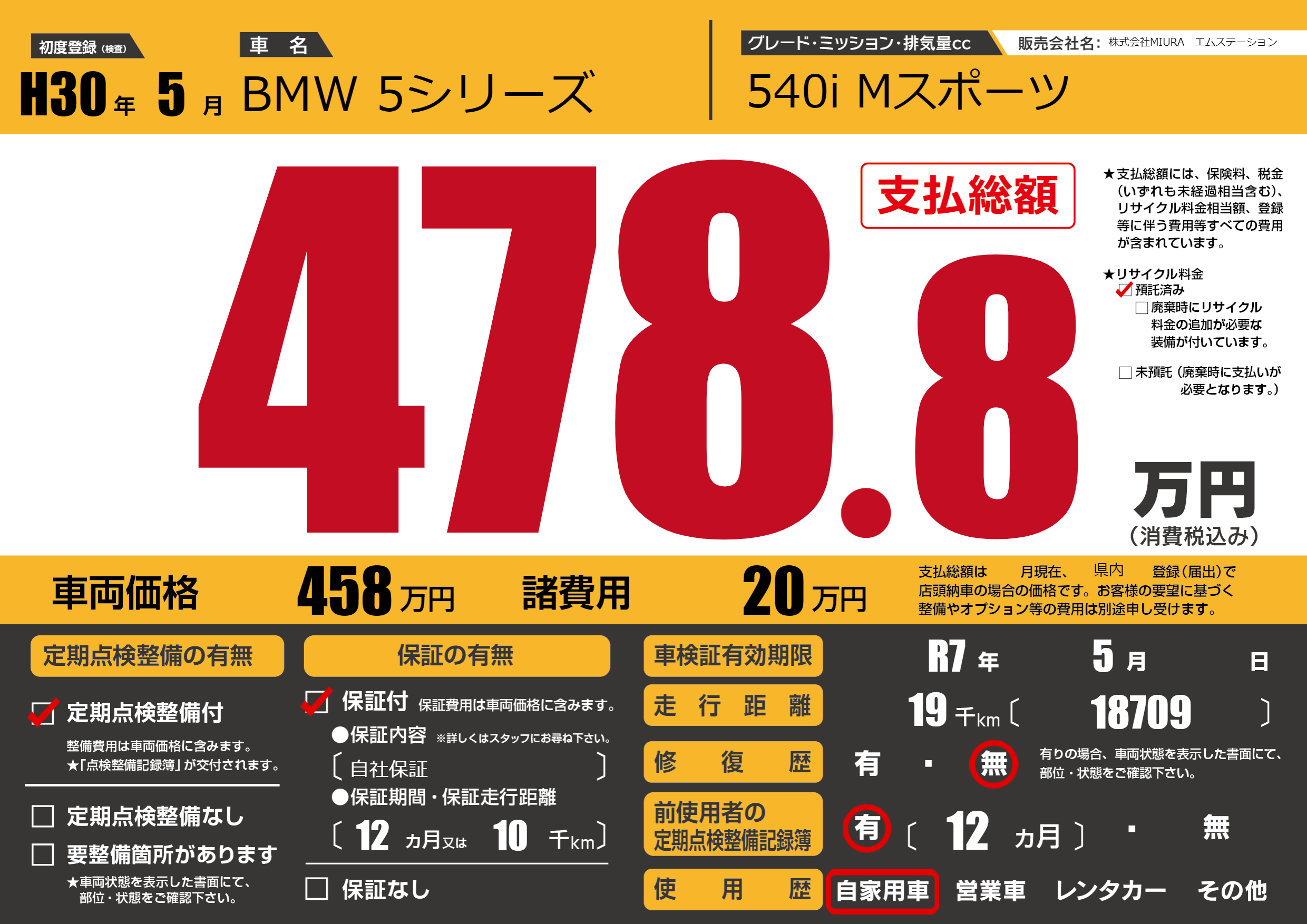 | 車名 | BMW 5シリーズ | グレード ミッション 排気量 |