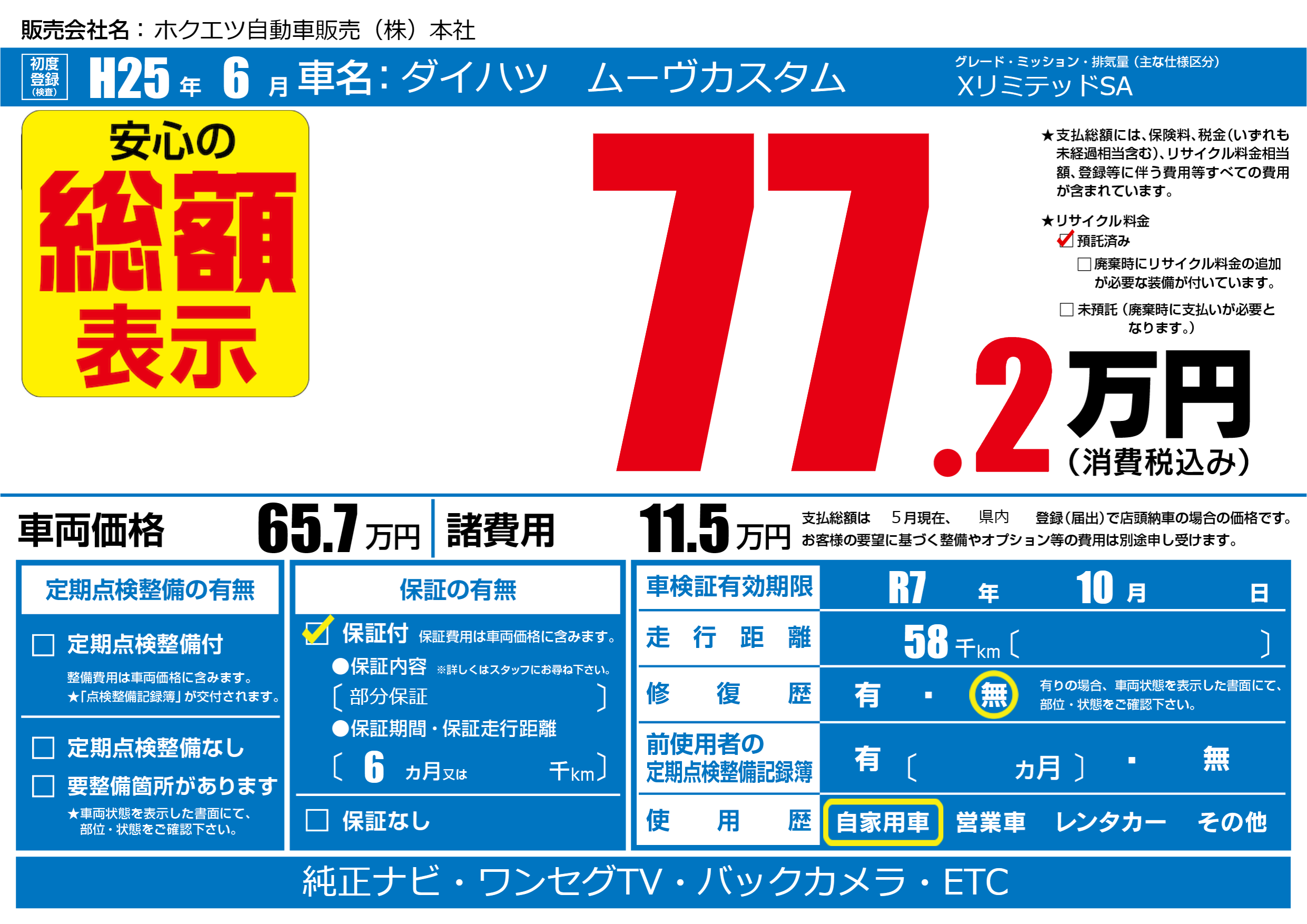 | 車検制限 | R7 年 10月 - 日 | ||