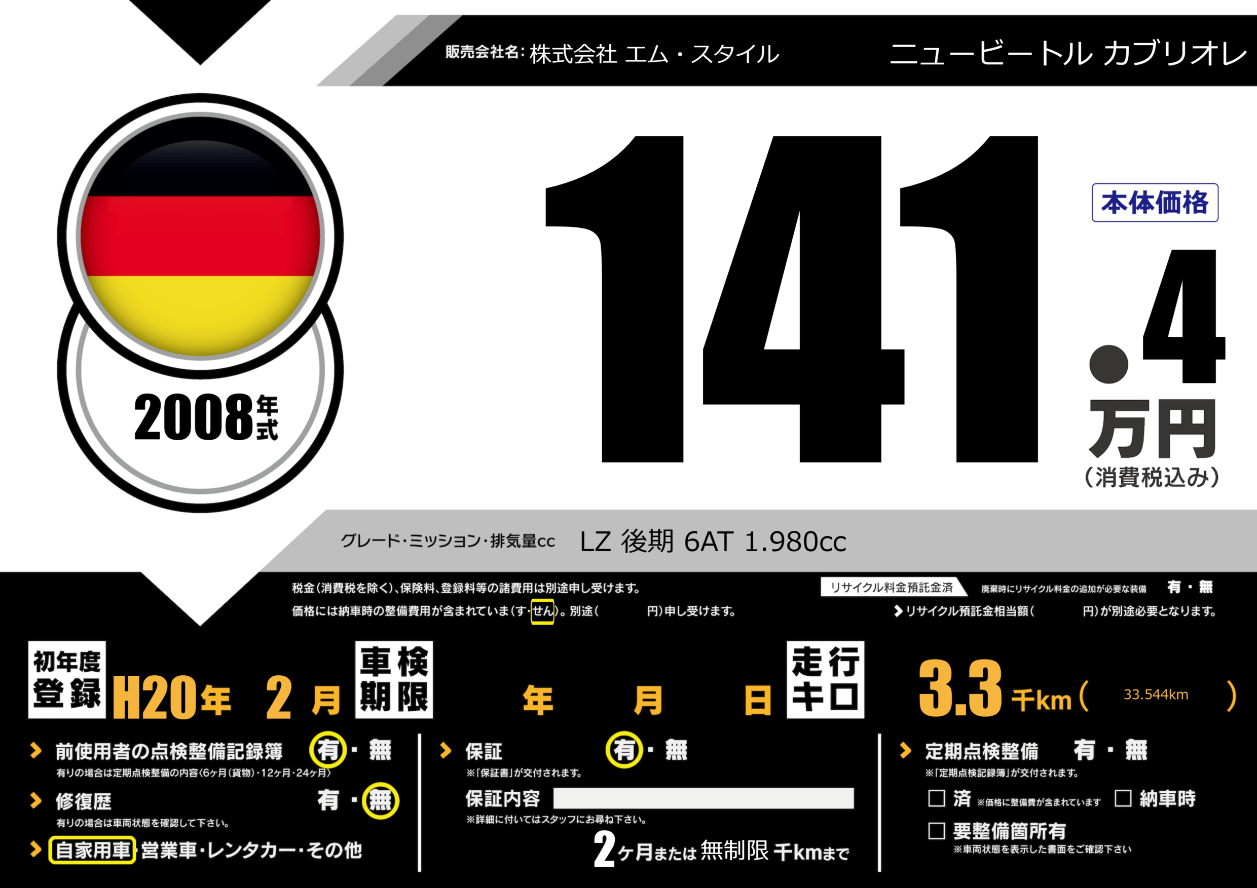 保証付き 保証内容() 2ヶ月または無制限千km |