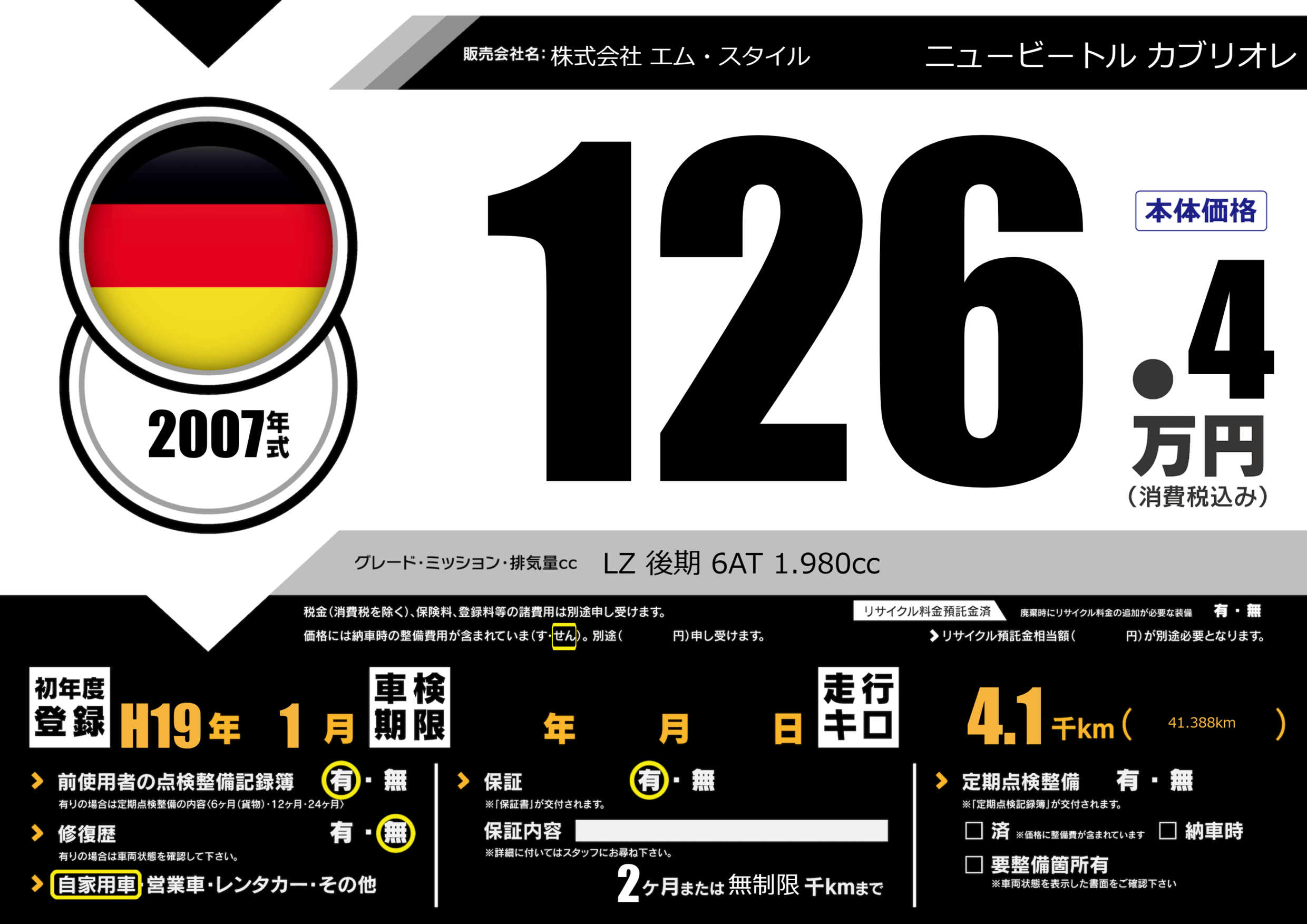 | 車名 | ニュービートル カブリオレ | グレード ミッション 排気量 |