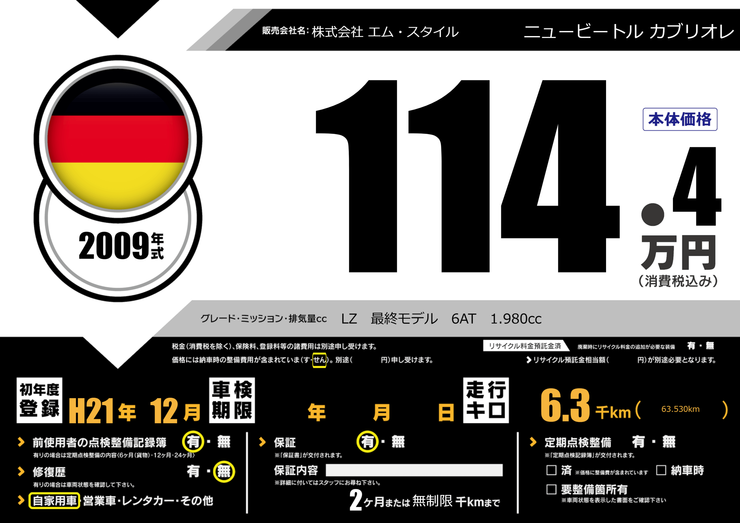 | 車名 | ニュービートル カブリオレ | グレード ミッション 排気量 |