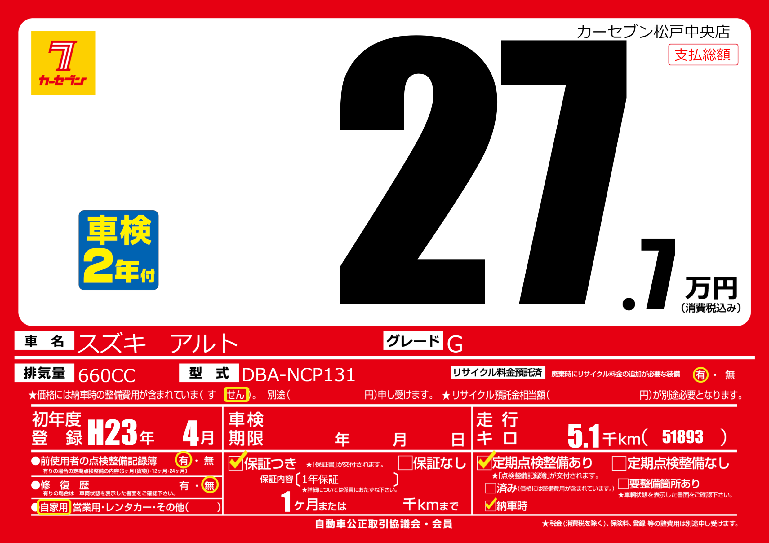 | 車名 | スズキ アルト | グレード ミッション 排気量 |