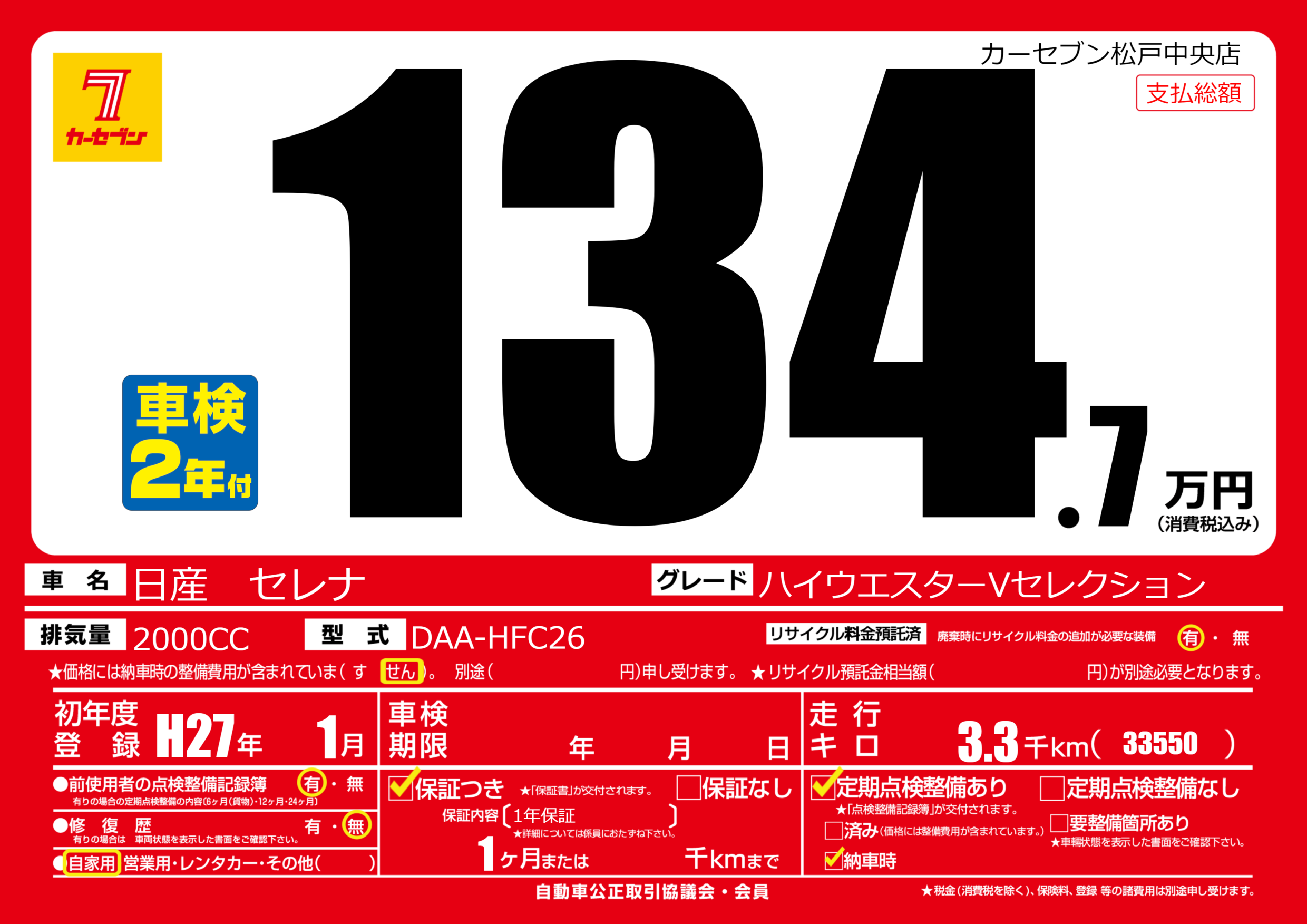 | 車名 | 日産 セレナ | グレード ミッション 排気量 |