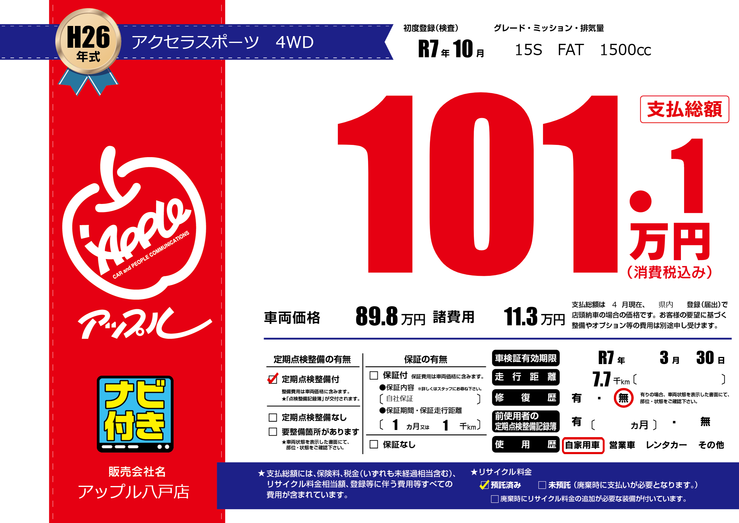なし | 車検制限 | R7年3月30月 |