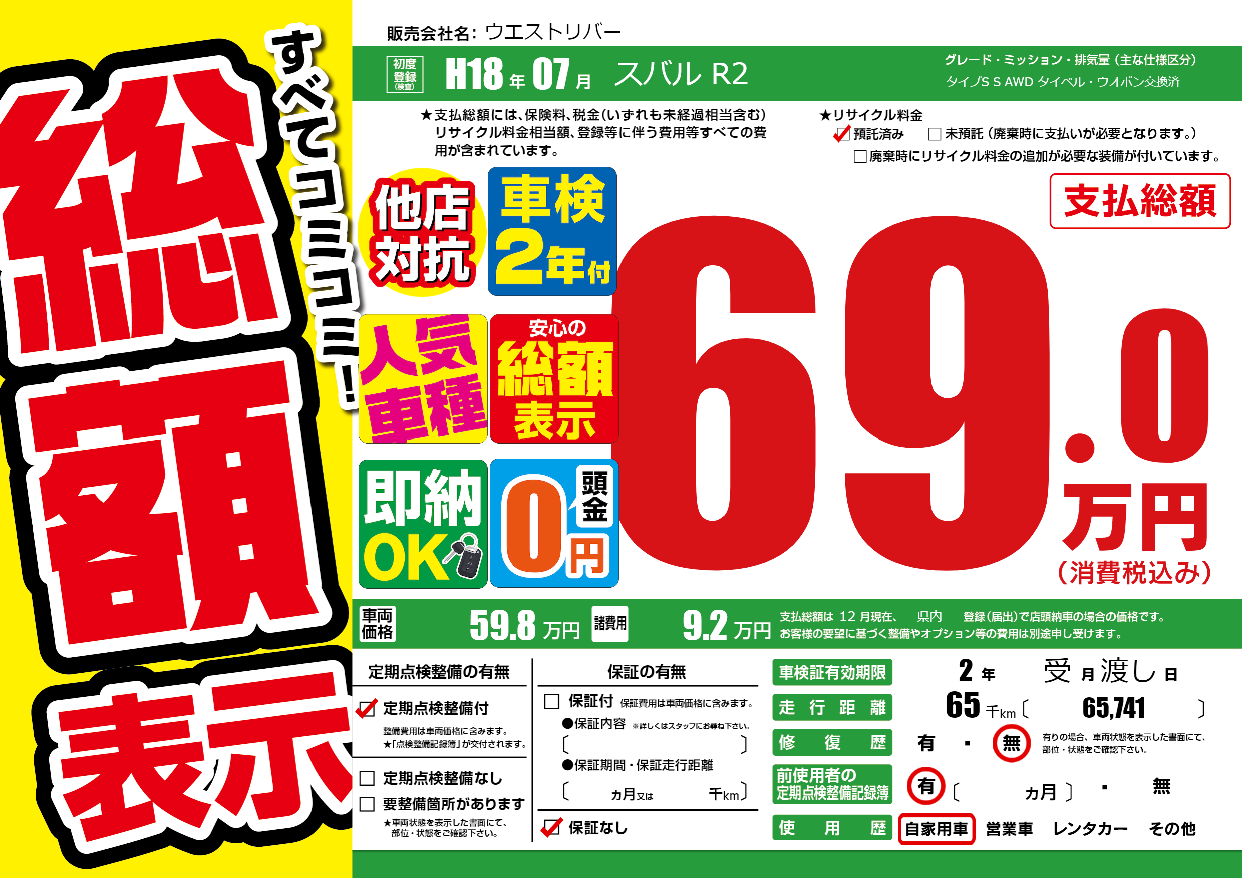 | 走行キロ | 6.5万km | 初年度登録 | H18年07月 |